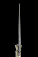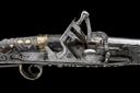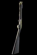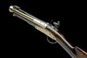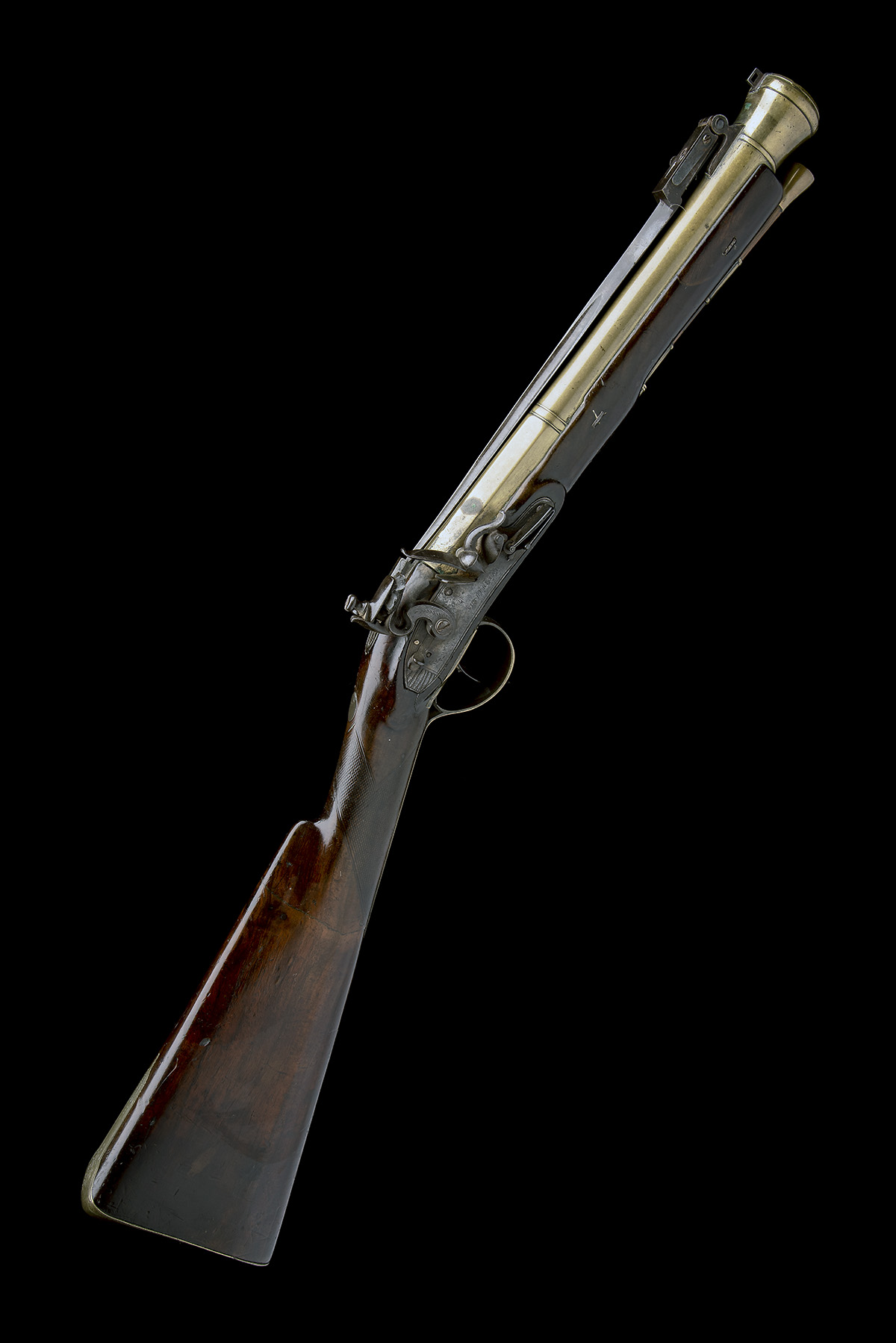 circa 1815, with 12in. triple staged barrel, moulded bands at each intersection and at the flared muzzle, the top flat signed 'LONDON', Birmingham proofs, concaved faced triangular bayonet mounted along the top of barrel, hinged at muzzle and retained via a catch at tang, borderline engraved flat lock with clipped and engraved tail, sliding safe behind cock, rainproof pan, walnut full-stock chequered at the wrist (chequering rubbed, working brass plate repairs below lock and on side cheek, cracked through and repaired at front of comb), engraved brass furniture and original brass tipped ramrod, overall length 27 1/4in., weight approximately 5lbs.