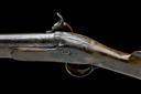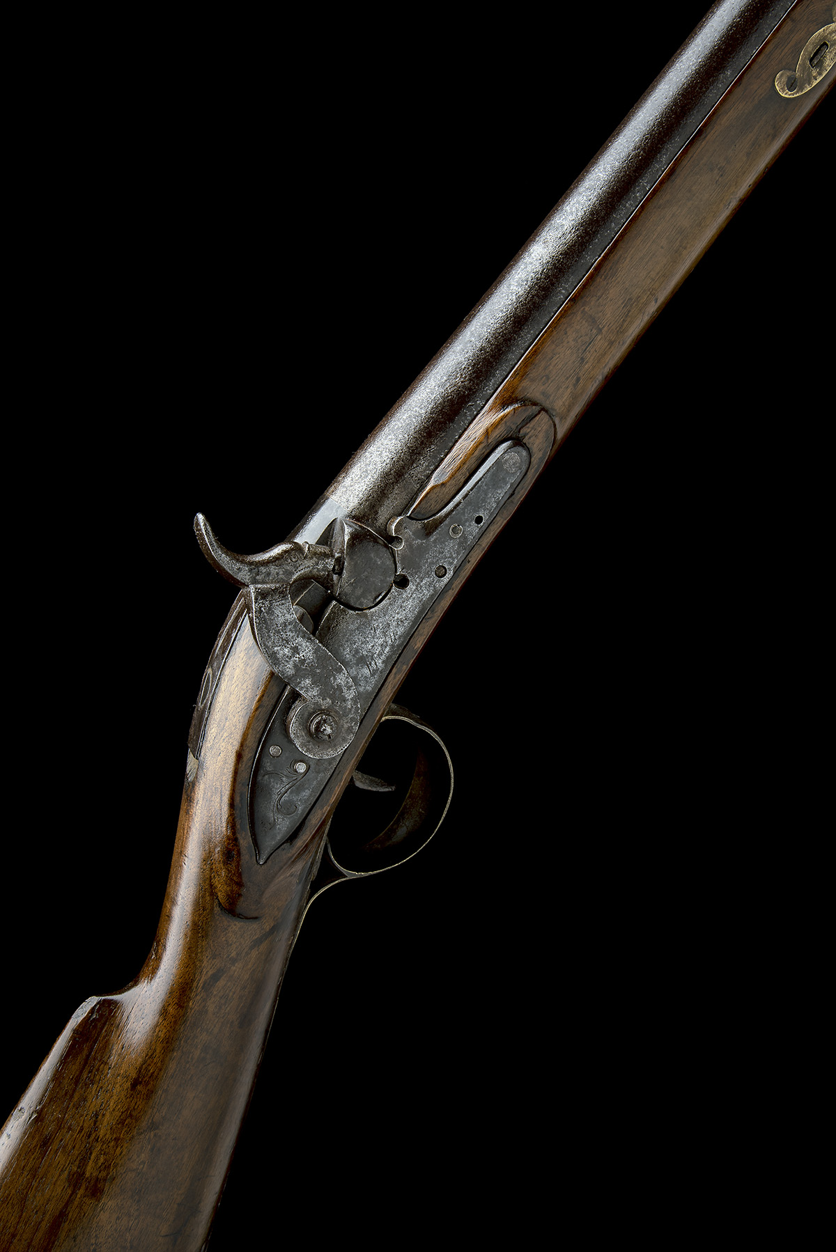 English, some parts third quarter of the 18th century, with round twist-iron 59 1/4in. barrel converted from flint (slightly bent out of true), hooked breech, radiused and curved lock-plate of flint form retaining pan cut-out and frizzen mounting holes, later engraving to the pointed tail and possibly signed 'FREETH' below the pan cut-out, slab-sided hammer, walnut half-stock renewed in antiquity retaining some early brass furniture, under-barrel rib with three thimbles (throat absent) and replacement ramrod, overall length 76in., weight approximately 13 7/8lbs.