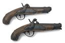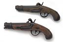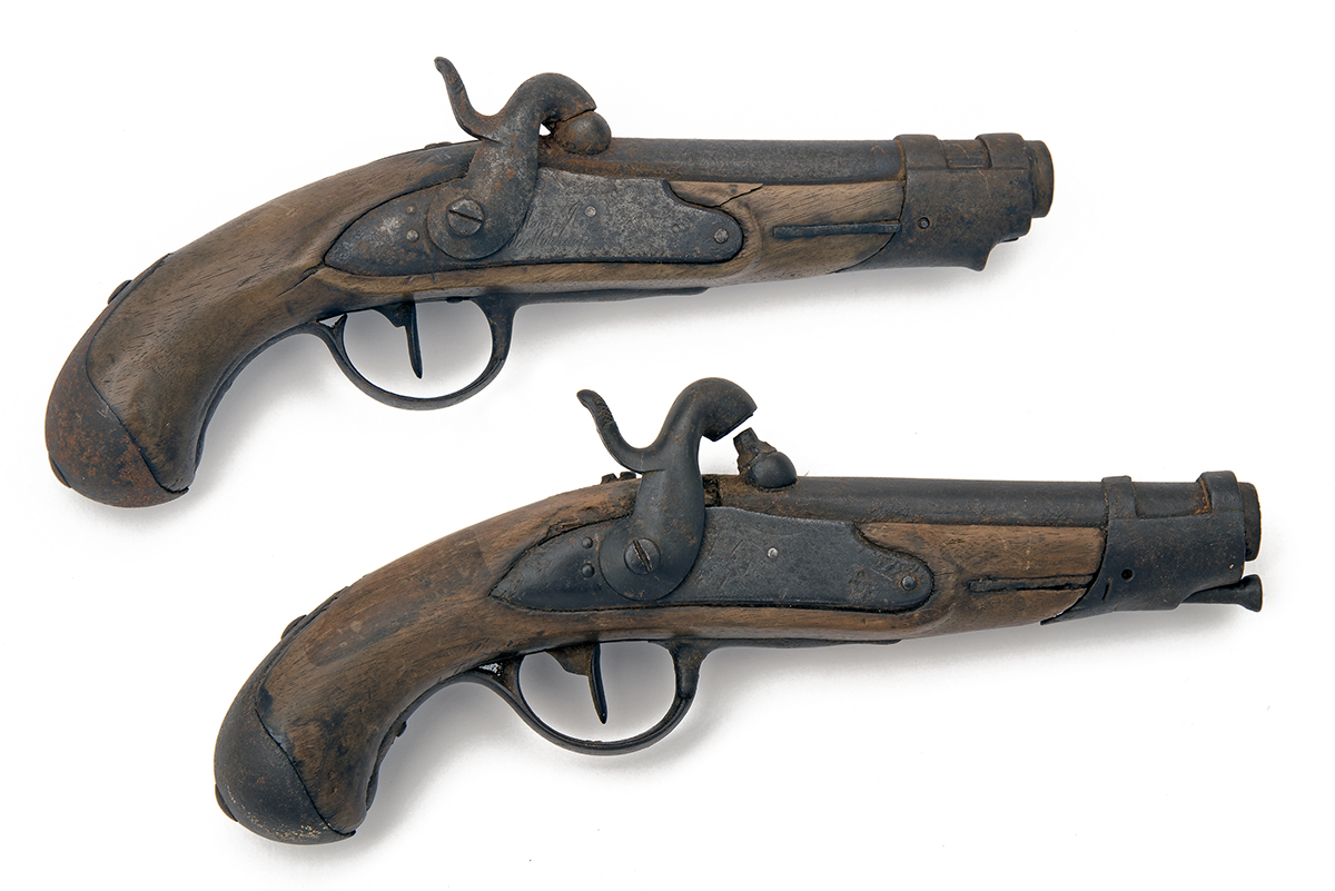 converted circa 1825, with round iron 5in. barrels, offset nipples, flat locks with radiused and pointed tails, traces of arsenal signatures below the original filled pan cut-outs, walnut full-stocks with semi birdshead butts, iron pommel-caps and trigger-guard bows, twin banded iron nose-caps and iron under-barrel ramrods (one missing), small losses and darkly stained throughout, each pistol 10in. overall and 1lb. approximately in weight