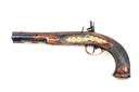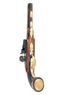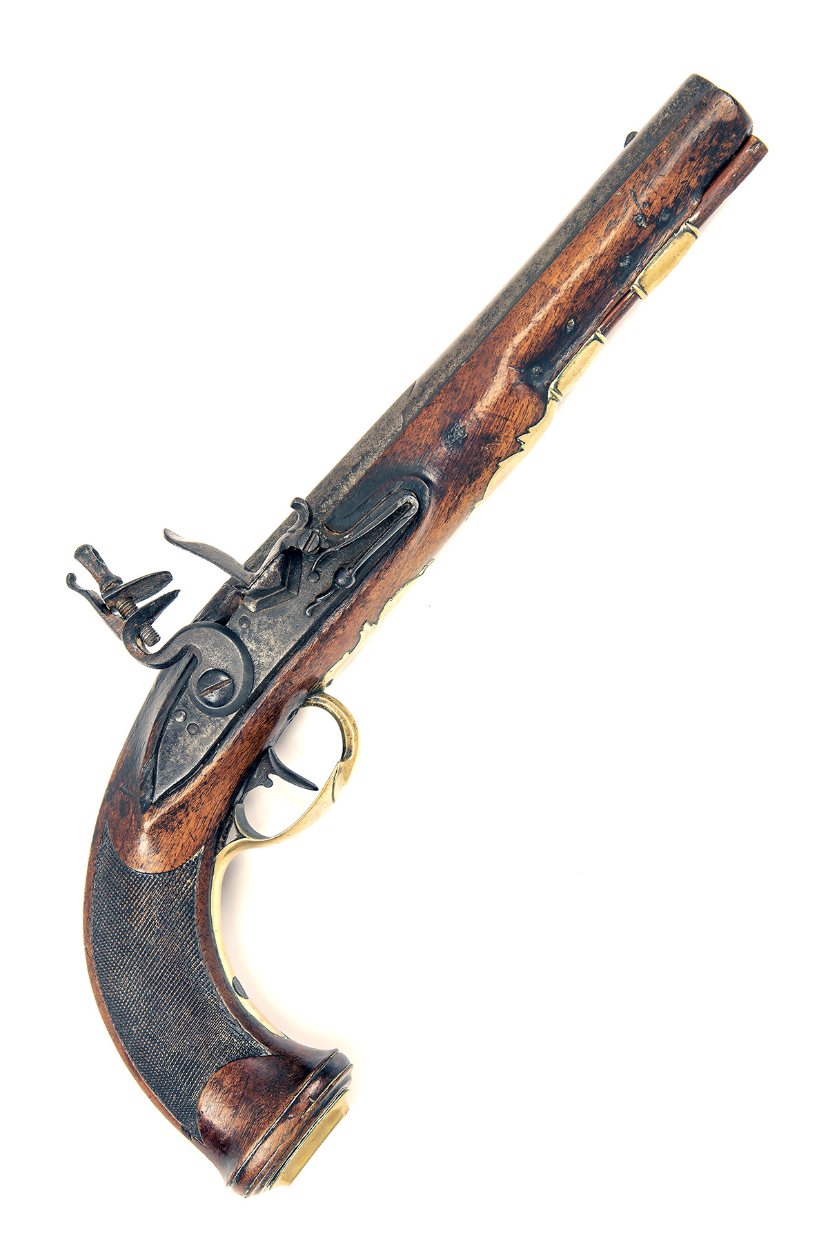 French or Belgian circa 1790, with octagonal to round 8in. barrel, small blade fore-sight to the front of the flat sighting plane, solid top-tang, plain flat lock with pointed tail, lozenge pan, swan-necked cock, bridleless frizzen, walnut full-stock with chequered panels to the grip, moulded band at pommel and bevel-edged flat brass pommel-cap, moulded brass sideplate, pillar fronted brass trigger-guard bow and brass ramrod throat and pipes, replacement ramrod, 14 1/2in. overall, weight approximately 2lbs.