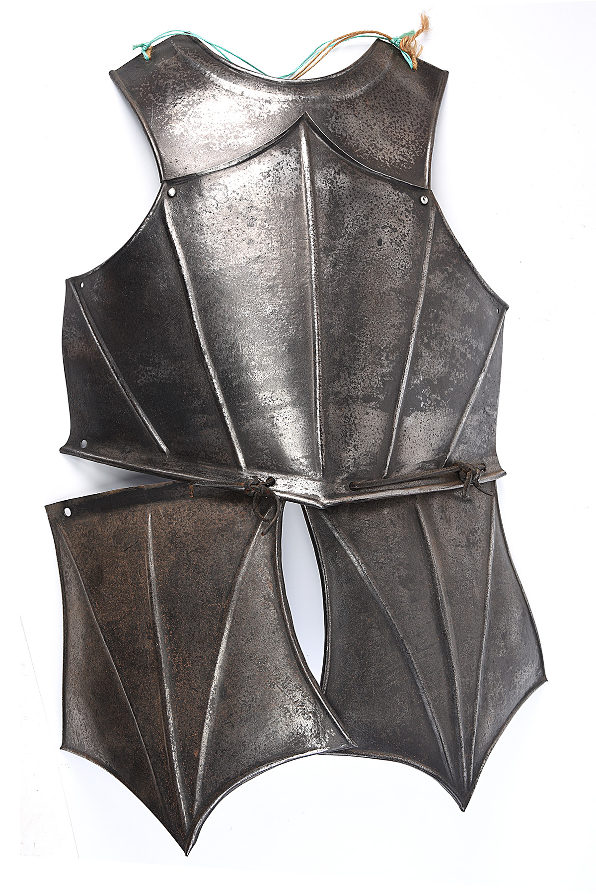 copy of a 17th Century cuirass armoured breast-plate and thigh skirts, made from pressed steel, some surface rust on the inside
