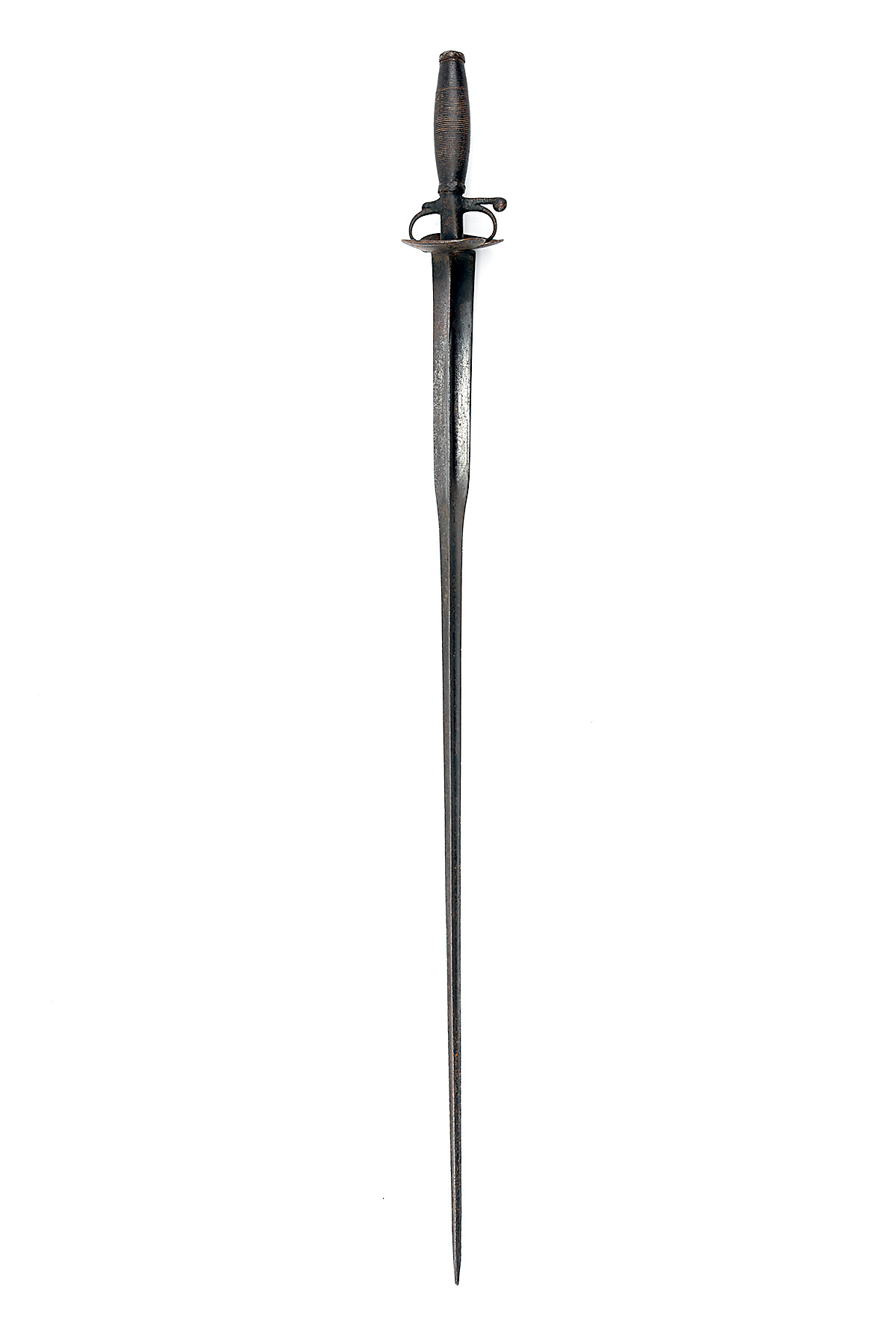18th Century, 31in. triangular blade narrowing after 7in. with faint traces of engraving, steel double-shell guard, finger-rings, missing knuckle-guard and pommel, relic condition, 37in. overall