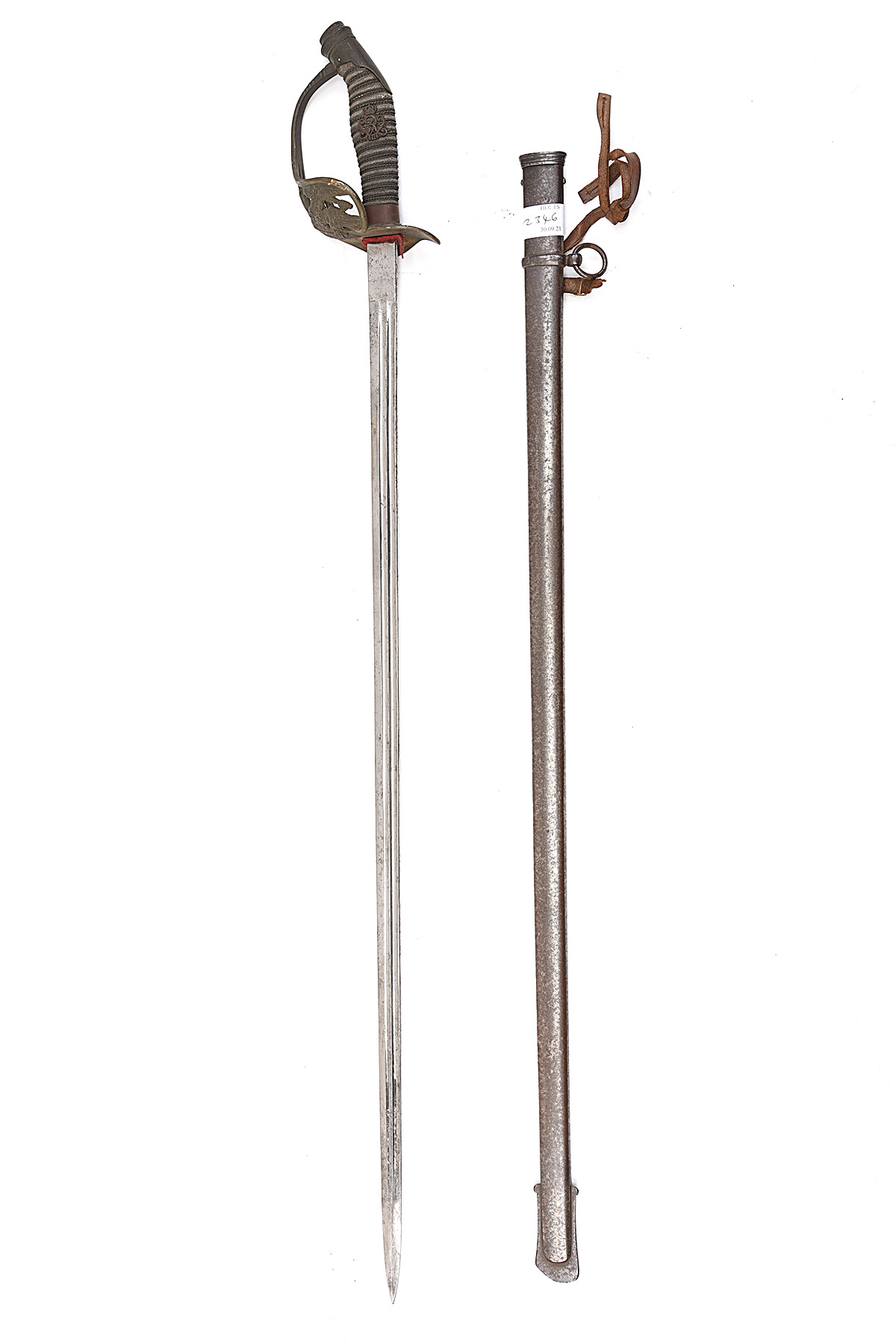 AN IMPERIAL GERMAN PATTERN 1889 INFANTRY OFFICERS SWORD, circa World War I, with 30 1/2in. paired double-fullered blade with the blacksmith symbol and 'P. O & Co' on the ricasso, pierced brass guard with Imperial Eagle, wire-bound grips with Imperial Crest to right and leather strap, steel scabbard with single suspension ring, blade clean, scabbard undented but some rust and pitting with strap remains, 38in. overall