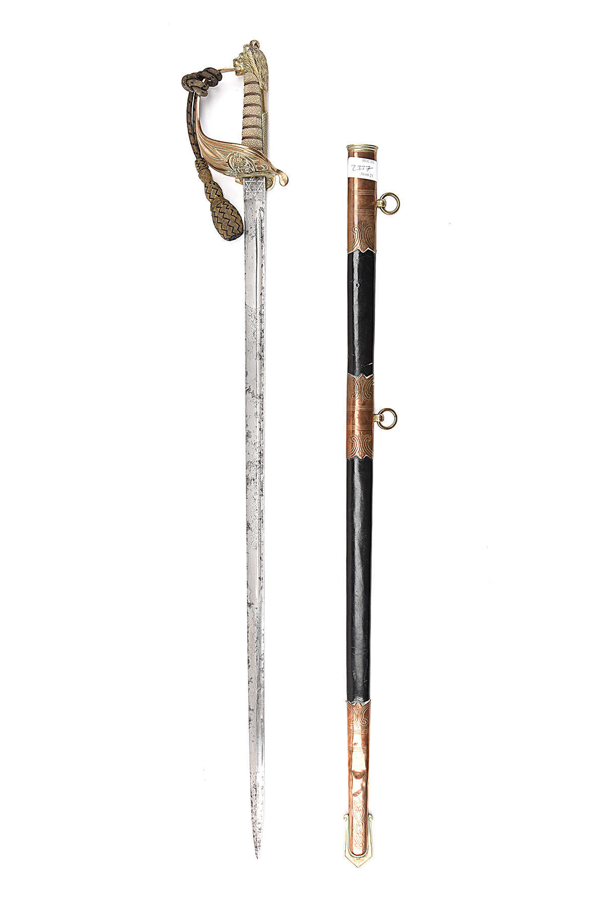 A ROYAL NAVAL RESERVE OFFICER'S SWORD, early-mid 20th Century, with 31 in. fullered blade (stained) etched with fouled anchor, rope scroll-work and royal cypher, 'PROVED' stamp and 'S. C. MOWER / & Co / MAKERS / SHEFFIELD' to ricasso, brass hilt with king's crown and fouled anchor with steel 'RNR' in knuckle-guard, folding scabbard-catch, white wire-bound grip, lion's head pommel, black leather scabbard with copper and brass fittings (some shallow denting), two suspension rings, 38 in. overall