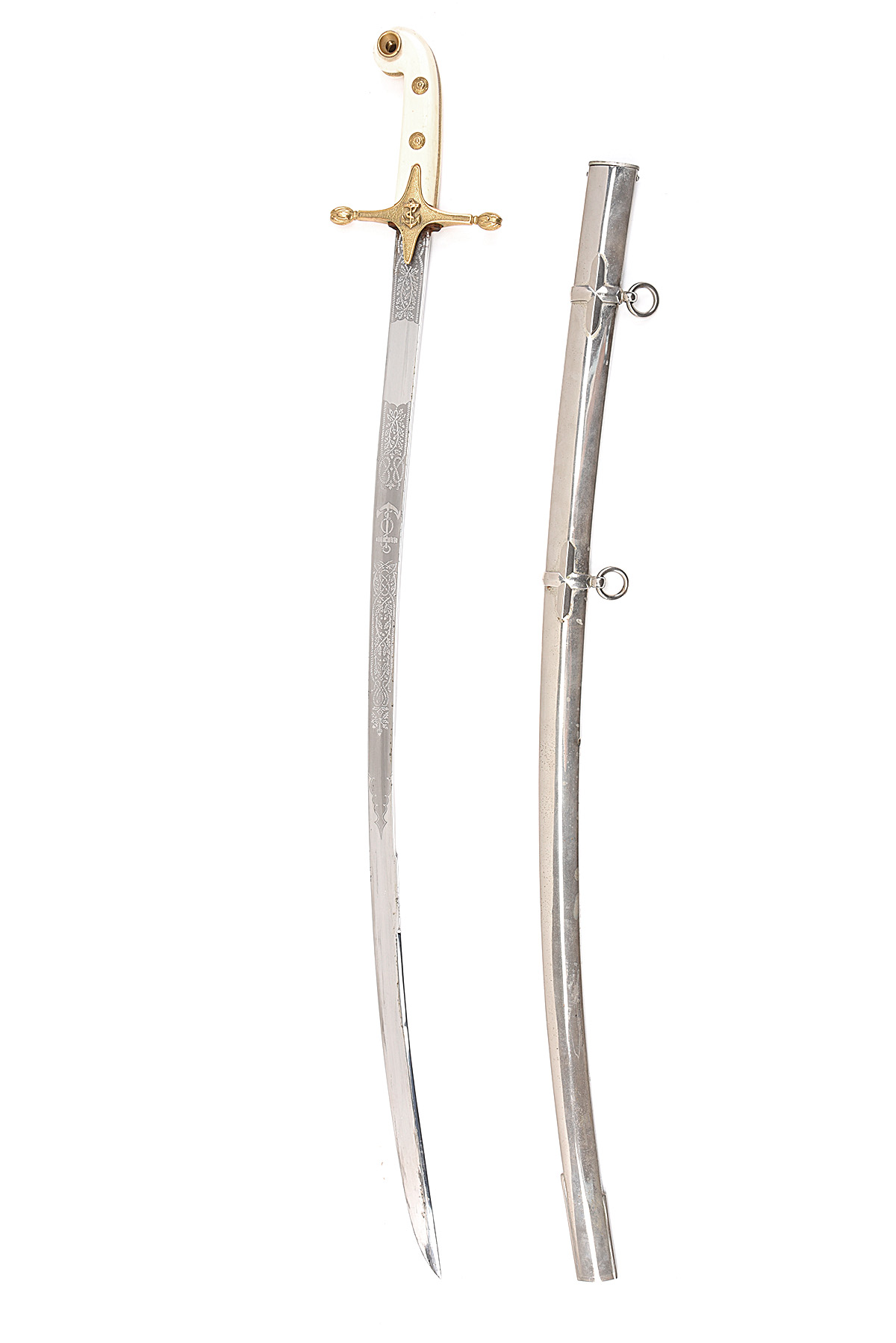 believed mid-20th Century, possibly American, with 31 in. blade etched with acorns and fouled anchor, guilt hilt with ivorine grips, fouled anchor on cross-guard, steel plated scabbard with two suspension rings, blade clean with occasional stain spots, stain pots to grips and scabbard