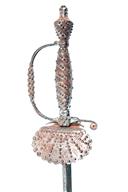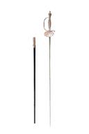 A MARCASITE COURT SWORD early 20th Century with 31in. etched triangular blade marked 'HILL BROs / OLD / BOND St / LONDON', steel hilt with inset marcasite beading, single shell guard, knuckle-guard, swollen grip and urn pommel, together with its black leather scabbard with steel locket, fittings lose, surface rust, chape missing from scabbard, 38in. overall