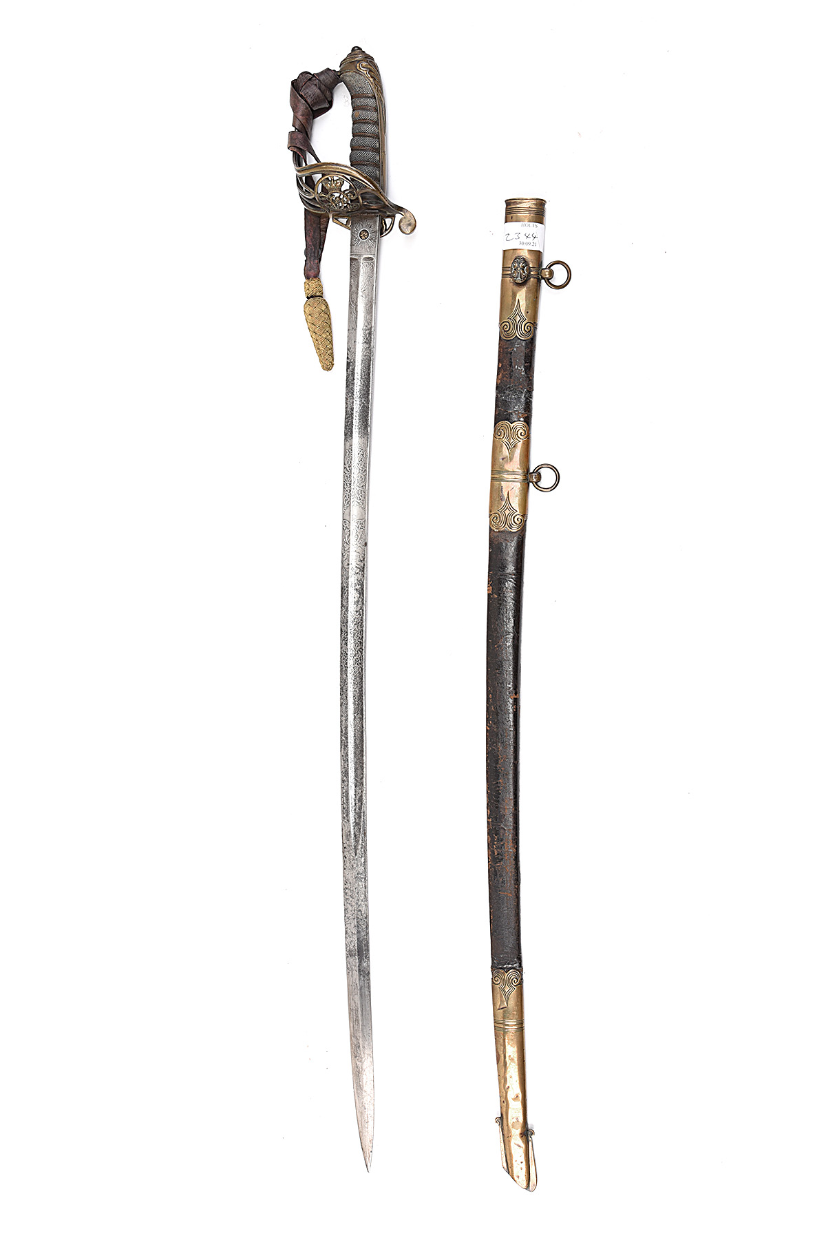 A PATTERN 1845 INFANTRY OFFICER'S SWORD, circa 1850, with 32 1/4 in. double-fullered stained blade, finely etched both sides with scroll-work and V R and crown cypher, brass proof plug inset into ricasso, with 'LANDON / & MORELAND / 17 / JERMYN St / LONDON' over, brass Gothic hilt with V R and crown cypher and folding guard, wire-bound fishskin grip, worn sword-knot, worn and repaired black leather scabbard with ornate but dented brass fittings, the reverse of the locket engraved 'H. BLACKMORE / 55 BROOK STREET / BOND STREET / LONDON', with the lower part of the chape worn away exposing the blade tip, 38 in. overall