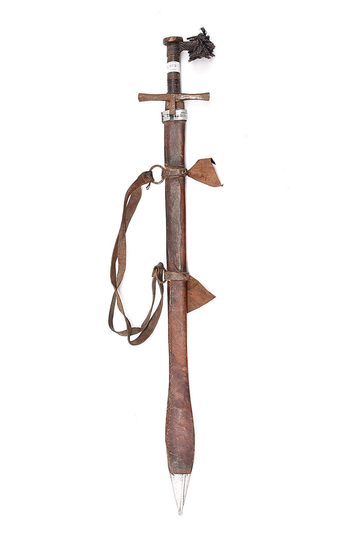 circa late 19th Century, blade frozen in scabbard, rusted steel cross-guard, part leather covered wooden grip and tassel-knot under exposed wooden pommel, decorated brown leather scabbard with decorated white metal locket and chape, two crude rusted steel suspension rings, leather strap, in semi-relic condition, 43 in. overall