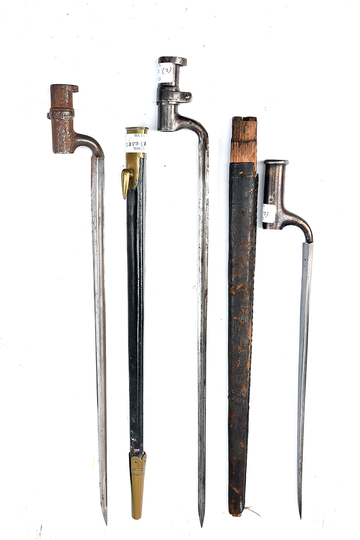 A GROUP OF THREE SOCKET BAYONETS, one a Pattern 1853 of Indian arsenal manufacture, no markings, blade clean, socket rusted, together with its black leather scabbard, chape lose and damaged; one Brown Bess with inspection mark on ricasso, blade clean, socket stained, no scabbard; and one Austrian Model 1854 for the Lorenz Rifle, numbered on the elbow, some staining, scabbard in relic condition