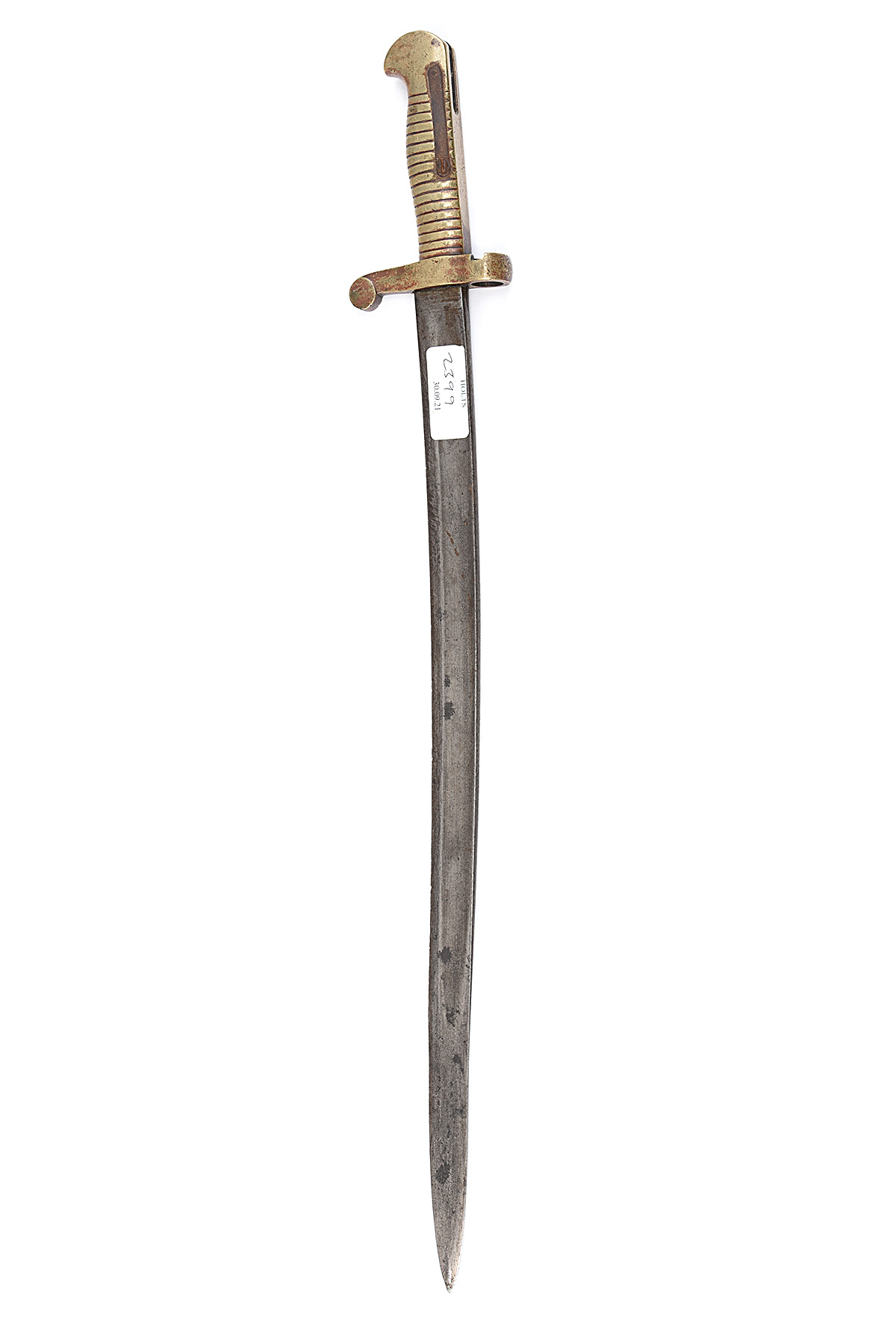 unmarked, possibly CSA, with one-piece brass hilt with steel spring (frozen and rusted) and mortise notch in barrel-ring, double-fullered steel yataghan blade of approx. 20 in., blade stained with notched cutting edge, no scabbard, 24 3/4in. overall