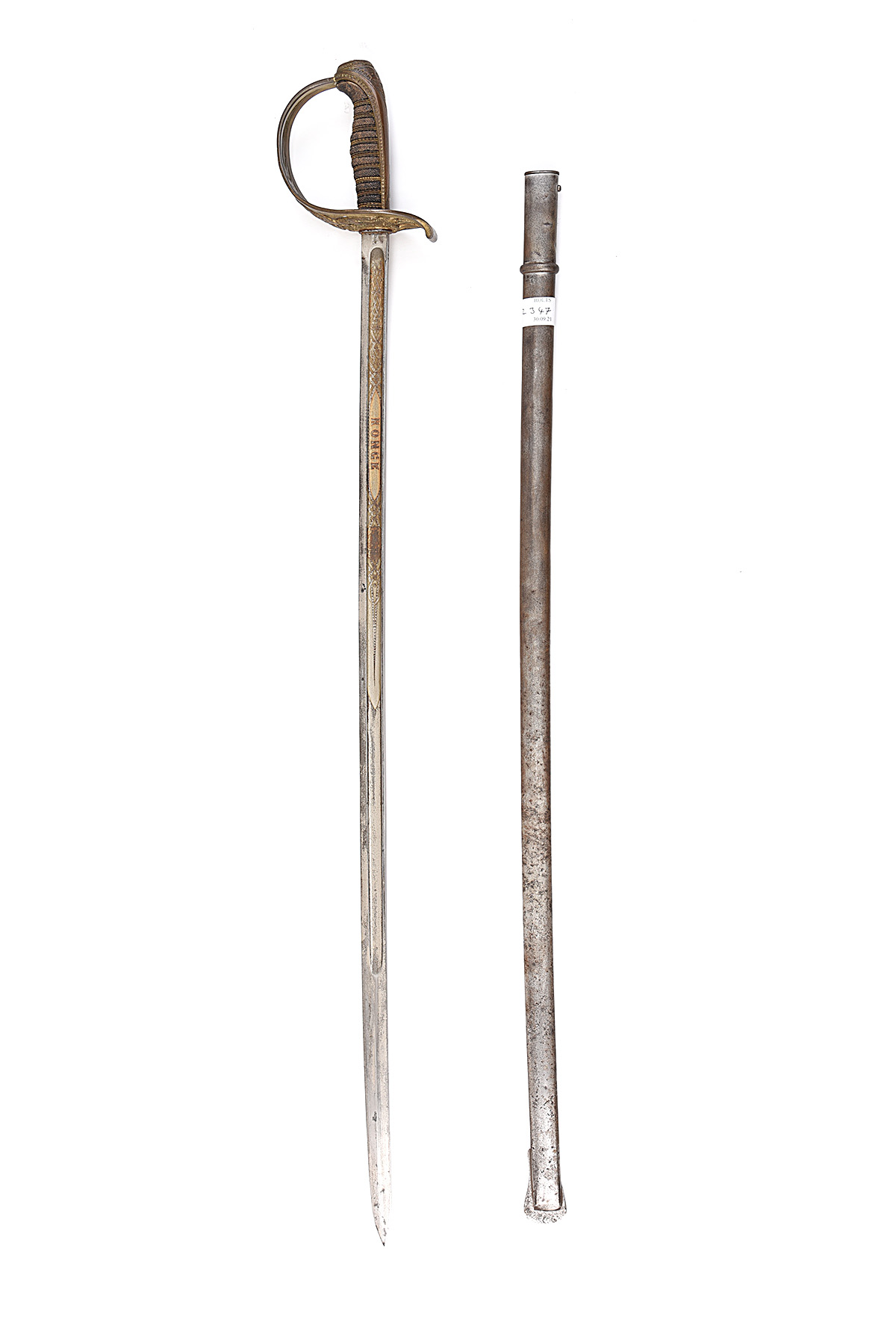 dated 1893 on blade back, blade 32 1/4in., double-fullered, with fullers engraved Nordic scroll-work, Danish rampant lion coat-of-arms, and 'KONGE' (king) on one side and 'FAEDRELAND' (country) to the other with traces of guilding and some staining, inspection marks to ricasso, brass latticed guard and back-strap, decorated with Danish symbols and coat-of-arms, ornate decorated pommel, brass wire-bound fishskin grips, together with its steel scabbard having some rust and denting, 38 in. overall