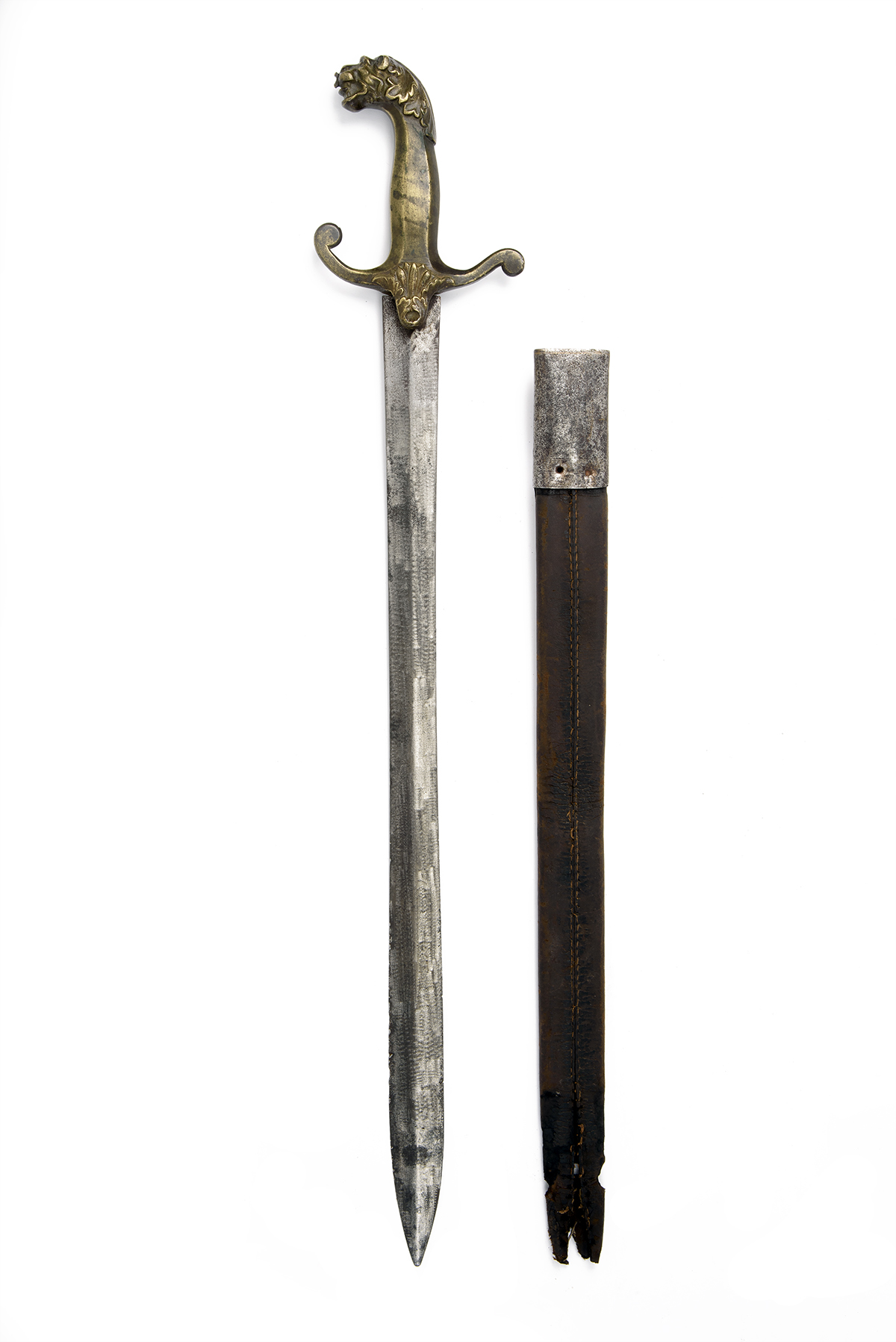 circa 1820, with plain, double-edged 21 in. blade, brass hilt with raised cross-guard and lion's head pommel, together with an associated scabbard with steel locket, blade stained with edge nicks and surface rust to ricasso, lion's mouth loop broken and chain missing, scabbard unlikely to be original, with rusted locket and missing the lower 3 inches, 26 in. overall