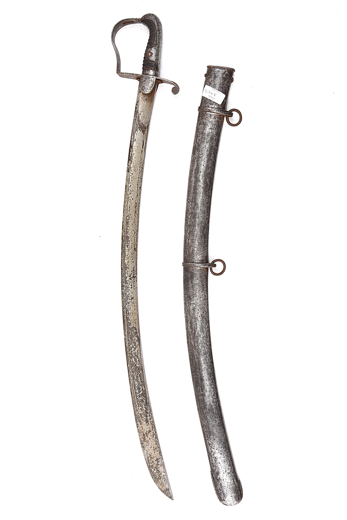 A PATTERN 1796 LIGHT CAVALRY SABRE, with 33in. blade, inspection mark to ricasso, stamped 'GILL' to blade back, twin langets, stirrup knuckle-bow, some small losses to grips, scabbard with two suspension rings, stained with some rust and pitting, 38 1/2 in. overall
