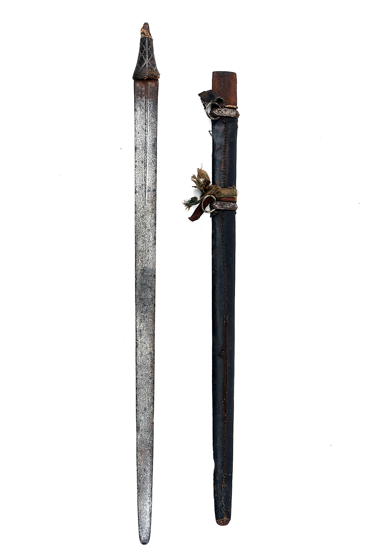 AN AFRICAN SWORD believed east African possibly Sudanese, with 34in. double-edged rusted plain blade with double-fullers extending 9in. below hilt, rounded tip, with wire bound wooden hilt decorated with white metal wire-work, broken off at the end of the tang, together with its leather-bound wooden scabbard with two suspension rings decorated with white metal inlay, relic condition, 38in. overall