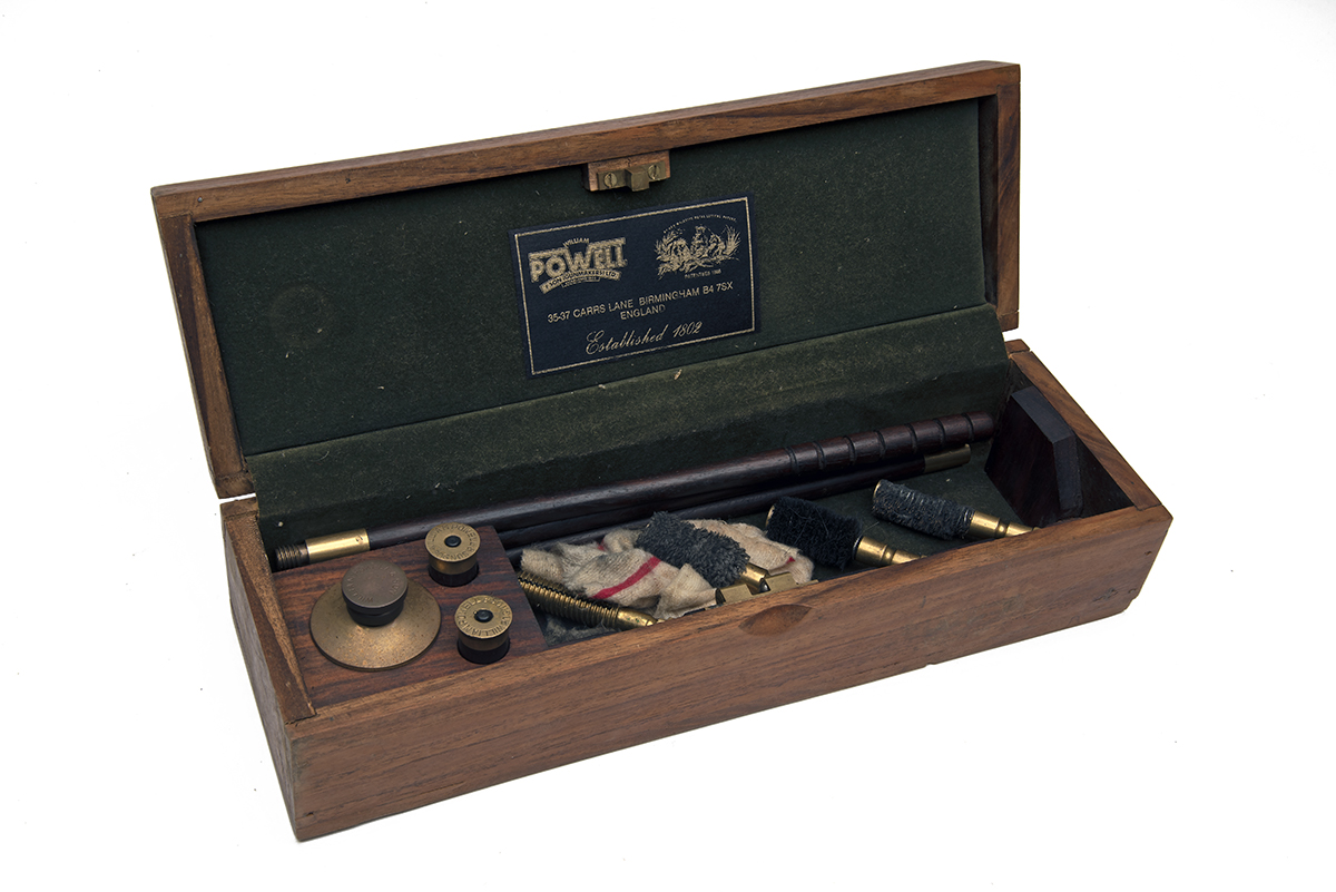 A WILLIAM POWELL CASED 20-BORE GUN CLEANING KIT, with two-piece cleaning rod oil bottle and a pair of snap-caps signed William Powell, cleaning heads