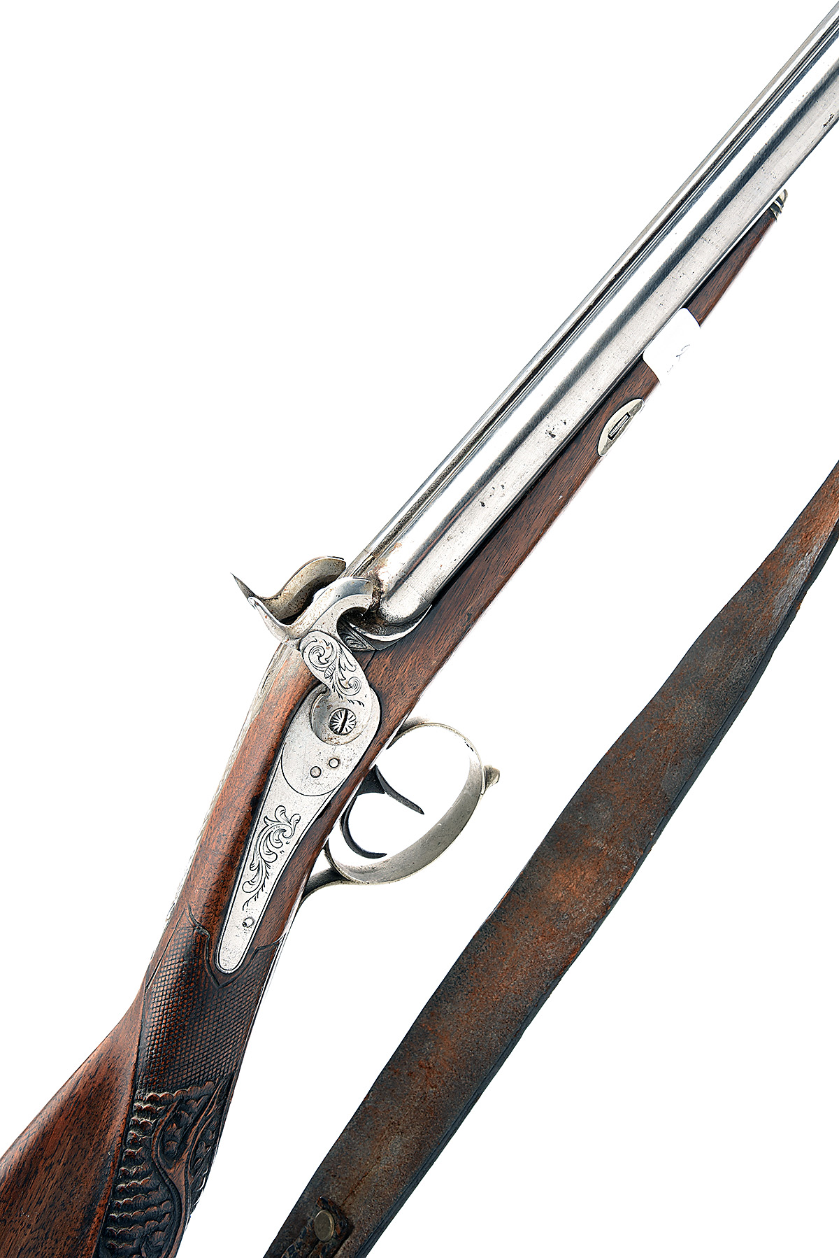 A 16-BORE PERCUSSION DOUBLE-BARRELLED SPORTING-GUN, UNSIGNED, no visible serial number,