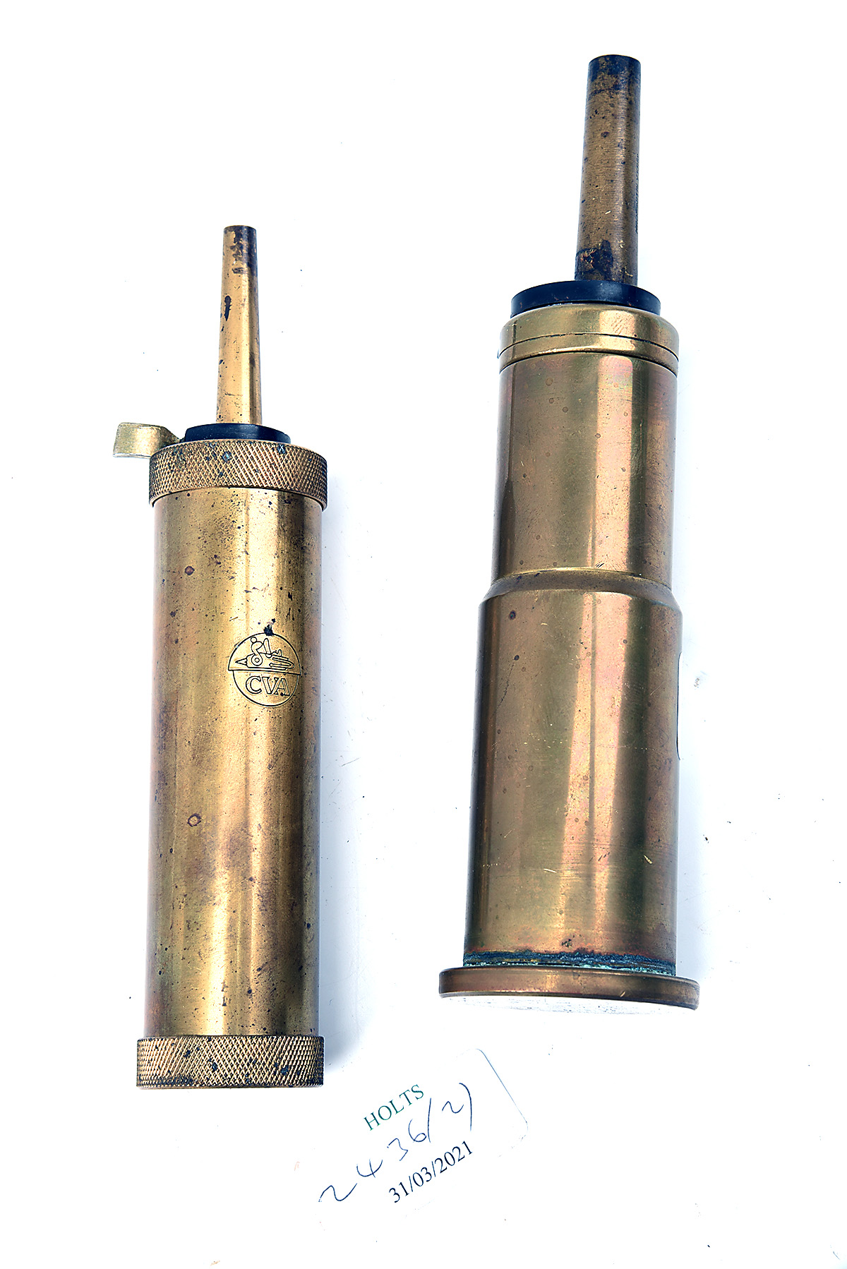 A PAIR OF MODERN HEAVY CYLINDRICAL BRASS POWDER FLASKS one 7 in. marked 'CVA' and one 7 1/2 in. unmarked, both used with functioning springs