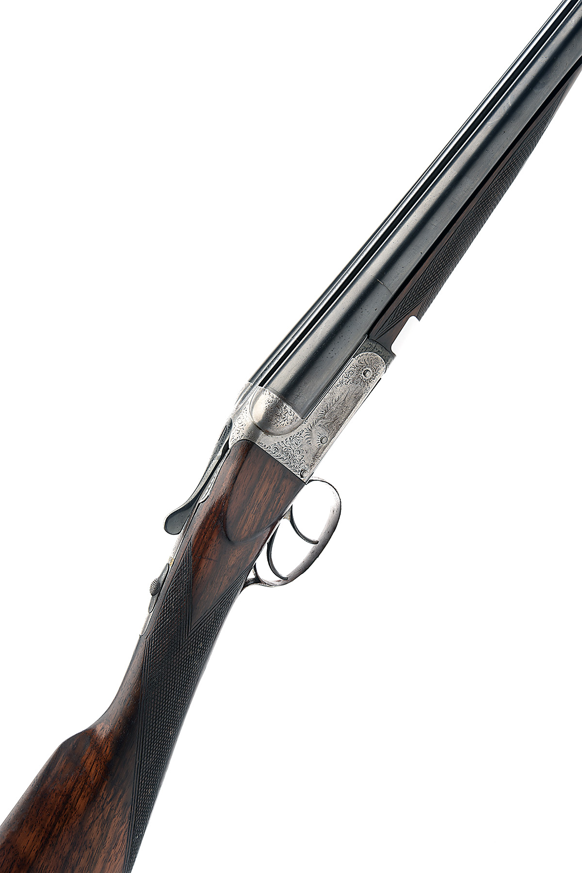 WARD & SONS 20-BORE BOXLOCK NON-EJECTOR, serial no. 49356, circa 1900, 28in. sleeved nitro barrels, rib engraved 'WARD & SONS. CENTRAL GUN WORKS. BIRMINGHAM.', 2 1/2in. chambers, bored approx. true cyl. and 1/2 choke, unsigned treble-grip action, automatic safety, partial acanthus scroll engraving surrounding game scenes, 15 1/2in. stock including 1 1/4in. wooden extension, fore-end missing finial