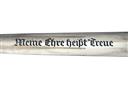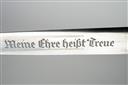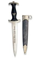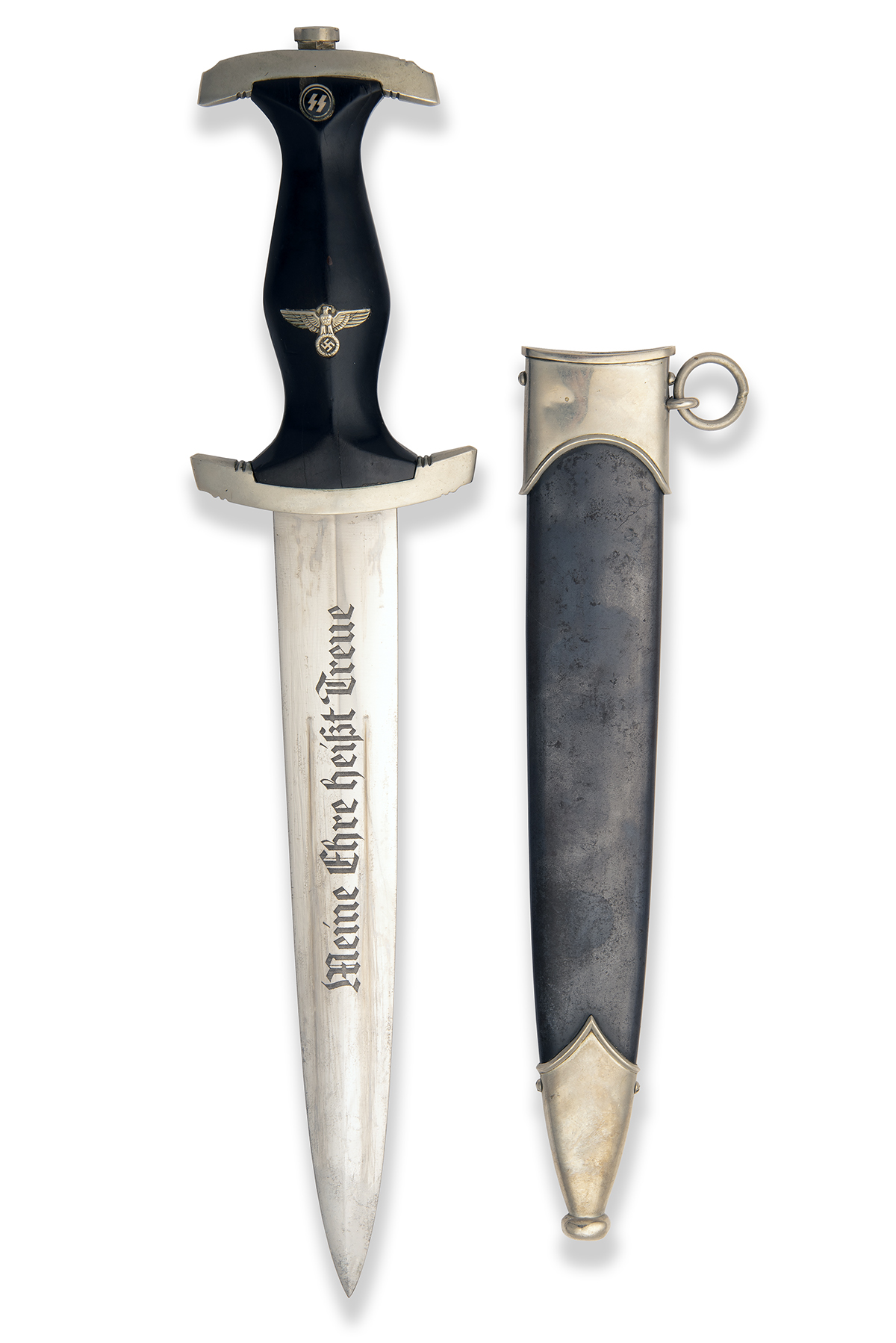 pre World War Two, with broad tapering 8 5/8in. double-edged blade etched with the motto 'MEINE EHRE HEISST TREUE', the obverse with the 'twin storks' trademark surrounded by the maker's name, solid nickel furniture, the cross-guard marked for area 'III', ebony hilt inlet with an eagle and swastika device and the 'ss' roundel (hairline cracks) and complete with its black anodised scabbard with nickel fittings. overall length in scabbard 14 5/8in.