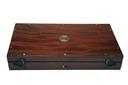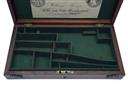 circa 1850 and possibly for a Transitional or Longspur style percussion revolver, compartmented and lined in green baize with compartments for multiple accessories, measuring externally 14 3/4in. x 7 3/4in. x 2 3/8in., ten-screw lid with circular brass escutcheon, hook and lock closure, missing key