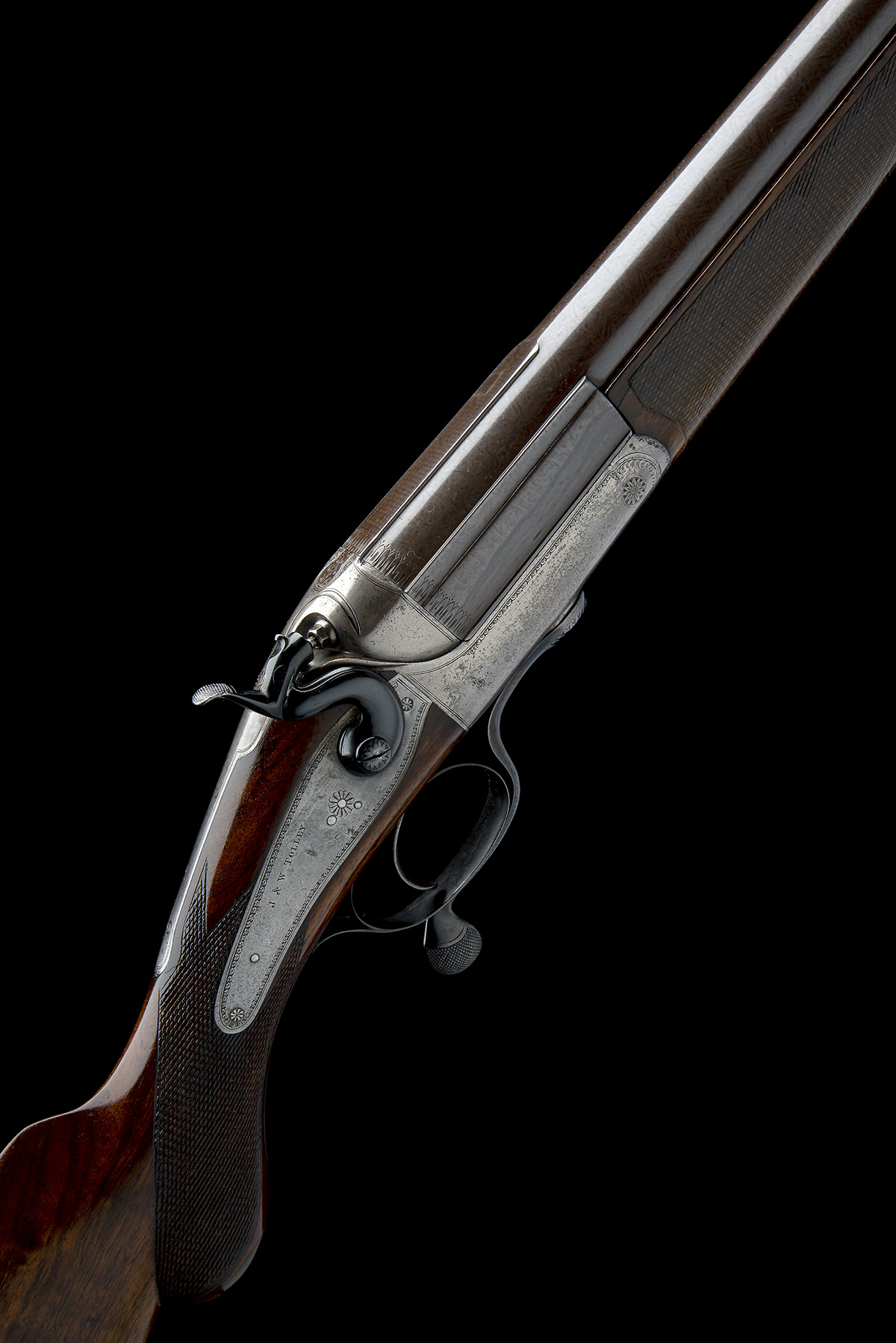 circa 1890, 32 7/8in. nitro reproved bold damascus barrel engraved 'J. & W. TOLLEY. MAKERS. 1. CONDUIT ST. REGENT ST. LONDON.', and with wave cut short sight rib, treble-grip action with Jones patent rotary underlever, carved percussion fence, rebounding back-action lock, border engraving, reblued furniture, 13 3/4in. semi-pistolgrip stock with domed horn pistolgrip-cap and 3/4in. rubber recoil pad, fore-end with Deeley & Edge patent release and horn finial, weight 8lbs. 8oz.