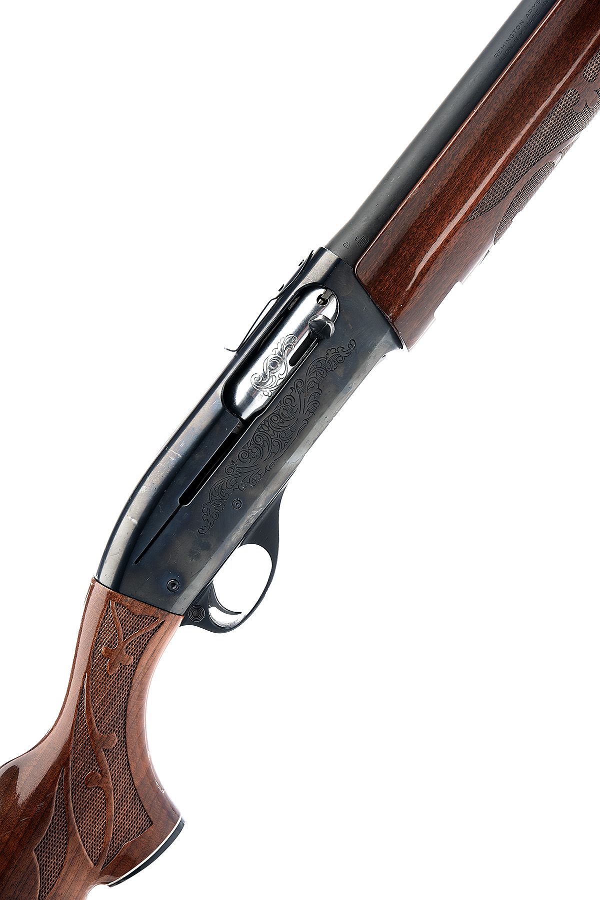 AN F.A.C. REMINGTON 12-BORE '1100' SEMI-AUTO SHOTGUN, serial no. N706582, for 1982, extended magazine, 28in. nitro ribless barrel, 2 3/4in. chamber, bored approx. full choke, receiver fitted with buckhorn sight, manual push-button safety, blacked action with acanthus scroll engraving the bolt carved en-suite, 14in. ornately chequered pistolgrip stock including trademark buttplate, weight 8lb. 5oz.