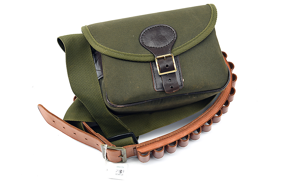 A COLLECTION OF SHOOTING RELATED ITEMS, comprising of a 12b cleaning kit cased, a cartridge belt, a canvas cartridge bag, a peltor ear defenders
