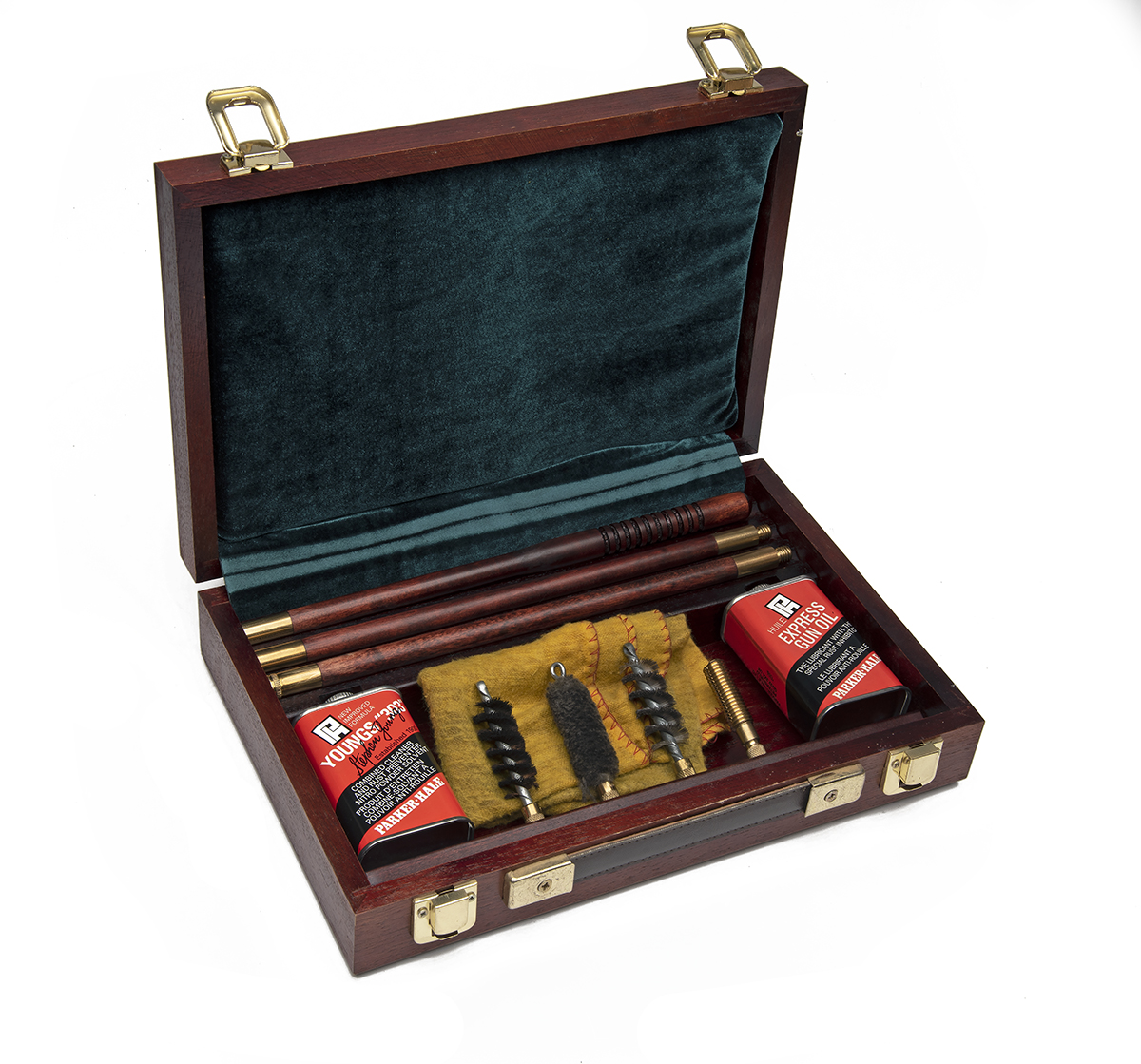 A PARKER-HALE CASED 12-BORE GUN CLEANING KIT, with three-piece cleaning rod, cleaning heads