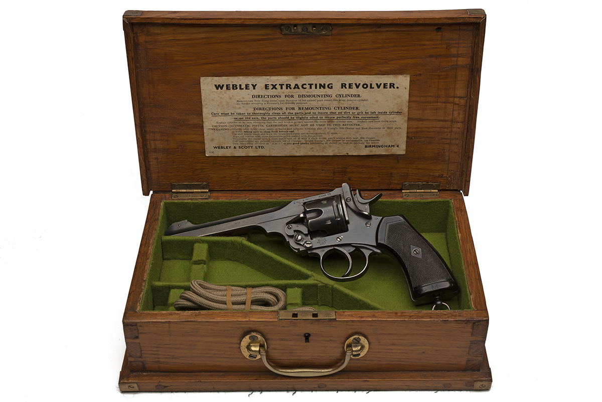 dated for 1917, with blacked 6in. barrel, break-open frame with auto-ejecting fluted cylinder, holster guides to sides of breech, double action mechanism and chequered hard rubber square-based grips, the whole retaining much period renewed military finish, 12 1/4in. overall and contained in an amateur produced wood case lined and compartmented in green baize, complete with a military style lanyard