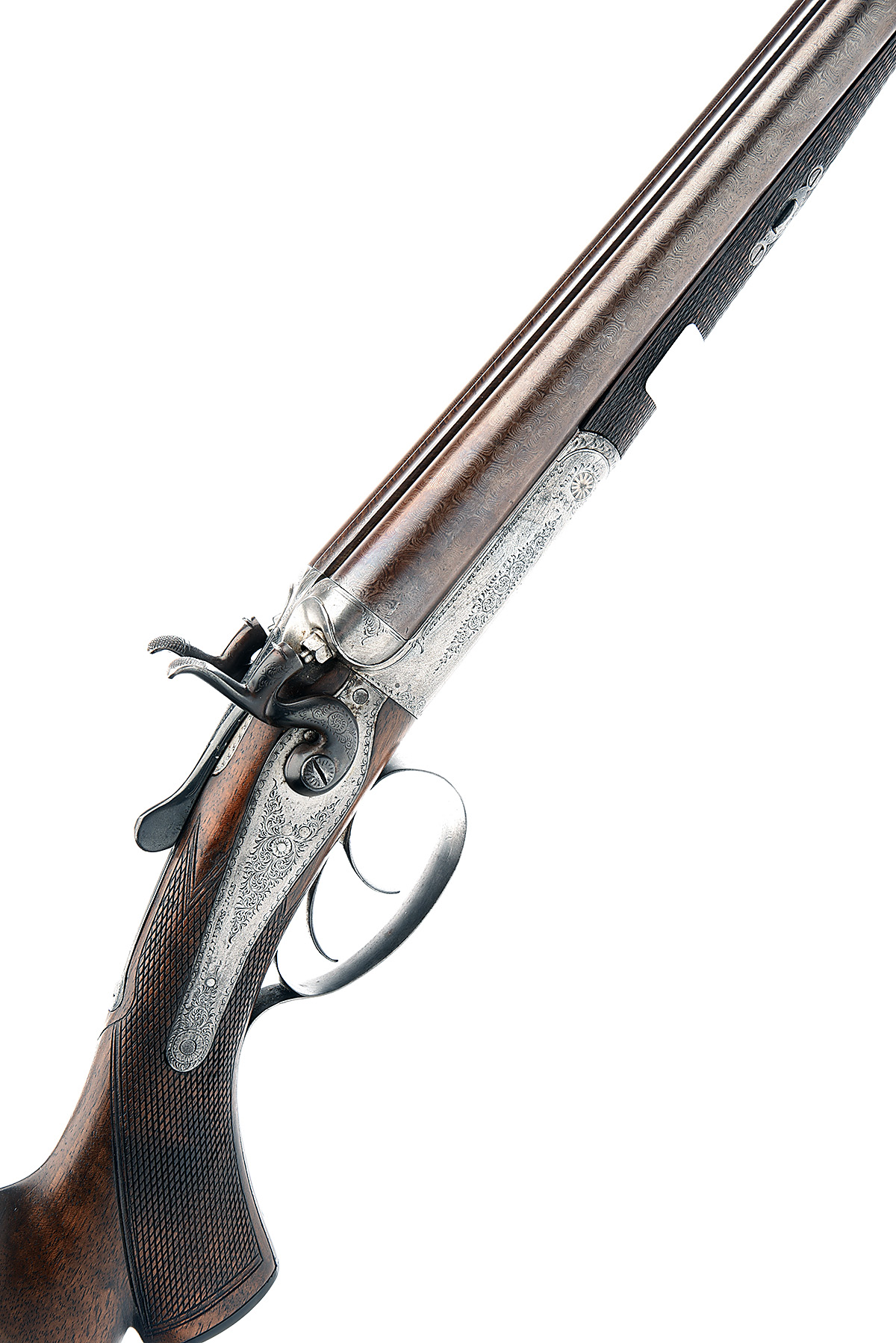 CHAS. LIVERSIDGE 20-BOE TOPLEVER HAMMERGUN, serial no. 5E, circa 1875, serial number on barrels only, 28in. nitro reproved damascus barrels, the rib engraved 'CHARLES LIVERSIDGE. GAINSBOROUGH.' (very faint), 2 3/4in. chambers, bored approx. true cyl. choke in both, rebounding back-action locks, border and partial acanthus scroll engraving, brushed bright and reblued finish, 14 1/4in. pistolgrip stock including steel heel and toe plates, pistolgrip cap, fore-end with cross-pin release catch and horn finial, weight 5lb. 9oz.