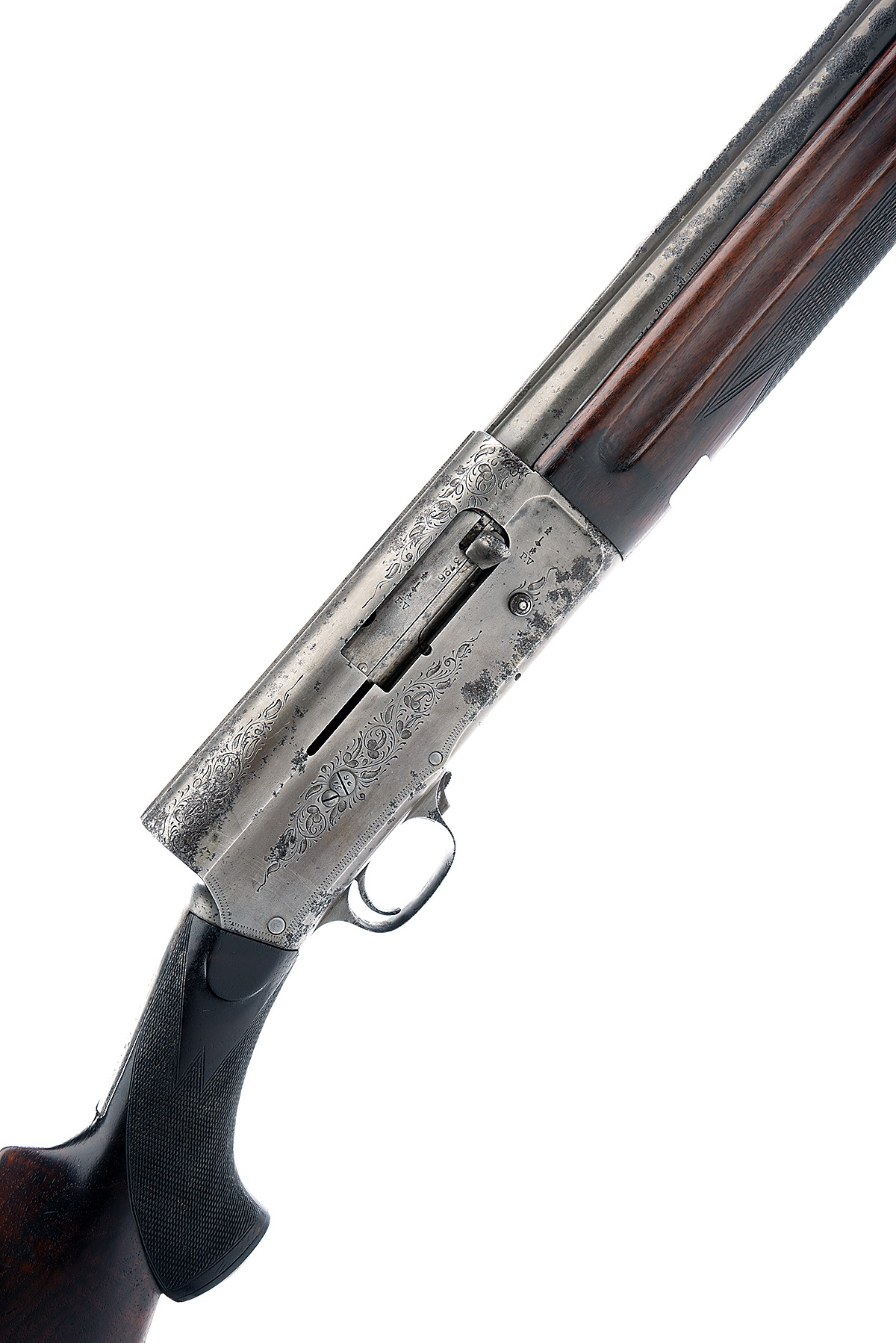 FABRIQUE NATIONALE 12-BORE 'AUTO-5' SEMI-AUTO SHOTGUN, serial no. 49421 / 143726 H, dated 1927, restricted magazine, 29 1/2in. nitro barrel with 7mm raised solid matt rib, 2 3/4in. chamber, bored approx. full choke, manual Garand-style safety, magazine cut-off switch, border and partial acanthus scroll engraving, 14 1/4in. figured pistolgrip stock including buttplate, cheek-piece, pistolgrip cap, sling swivels, the whole with surface pitting and corrosion, weight 8lb. 11oz.