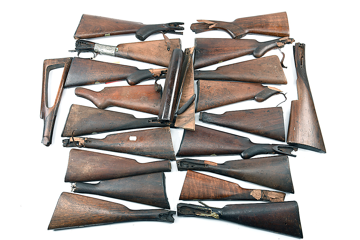 A COLLECTION OF 20 DAMAGED WALNUT GUN STOCKS, ideal for off cuts and repairs