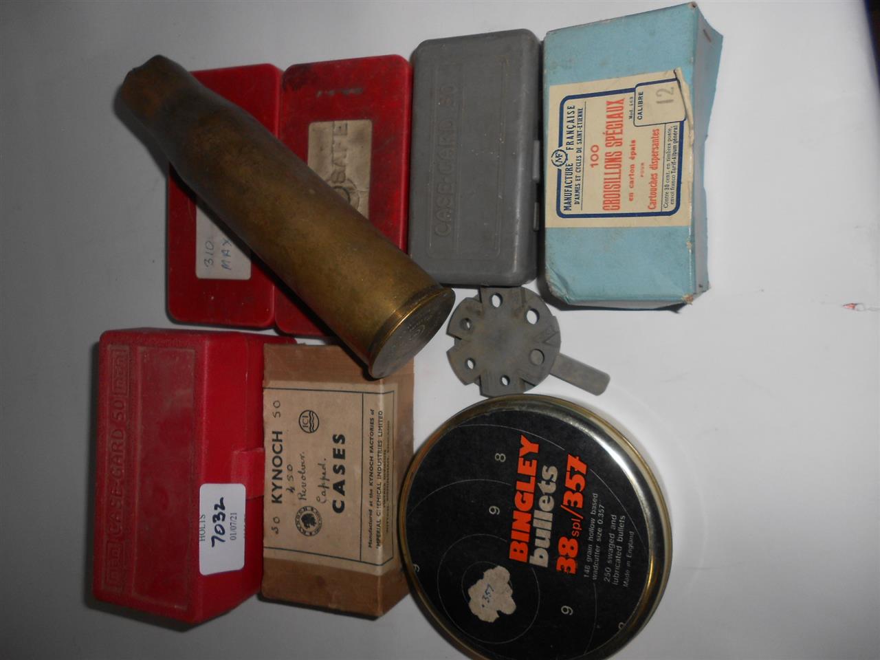 A COLLECTION OF 250 SWAGED WADCUTTER .38 Spl/.357 MAG LEAD BULLETS, A 37mm AAC SA GUN USA SHELL CASE WITH SPLIT NECK, VARIOUS EMPTY...