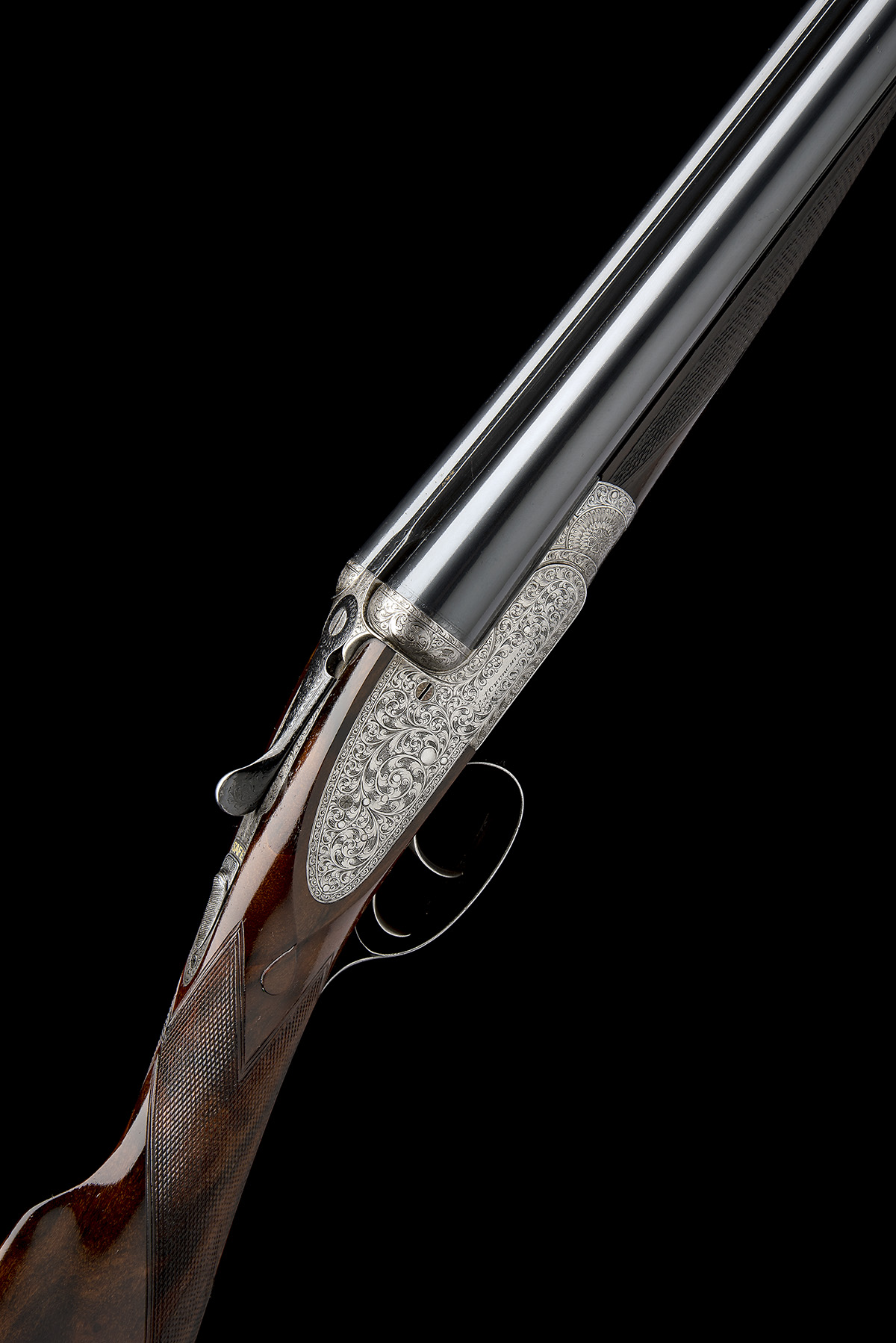 circa 1930, 25in. nitro barrels with Churchill-rib gold-inlaid 'XXV', the tubes engraved 'E.J. CHURCHILL (GUNMAKERS) LTD. ORANGE ST. GUNWORKS LEICESTER SQUARE. LONDON.', 2 1/2in. chambers, bored approx. true and imp. cyl., treble-grip action with hidden third bite and diminutive side bolsters, automatic safety with gold-inlaid 'SAFE' detail, bold acanthus scroll engraving, the undersides gold-inlaid with an Imperial crown, brushed finish, 13 1/4in. figured replacement stock (cast for central vision) including buttplate, weight 6lb. 1oz., in its makers leather 'VC' guncase