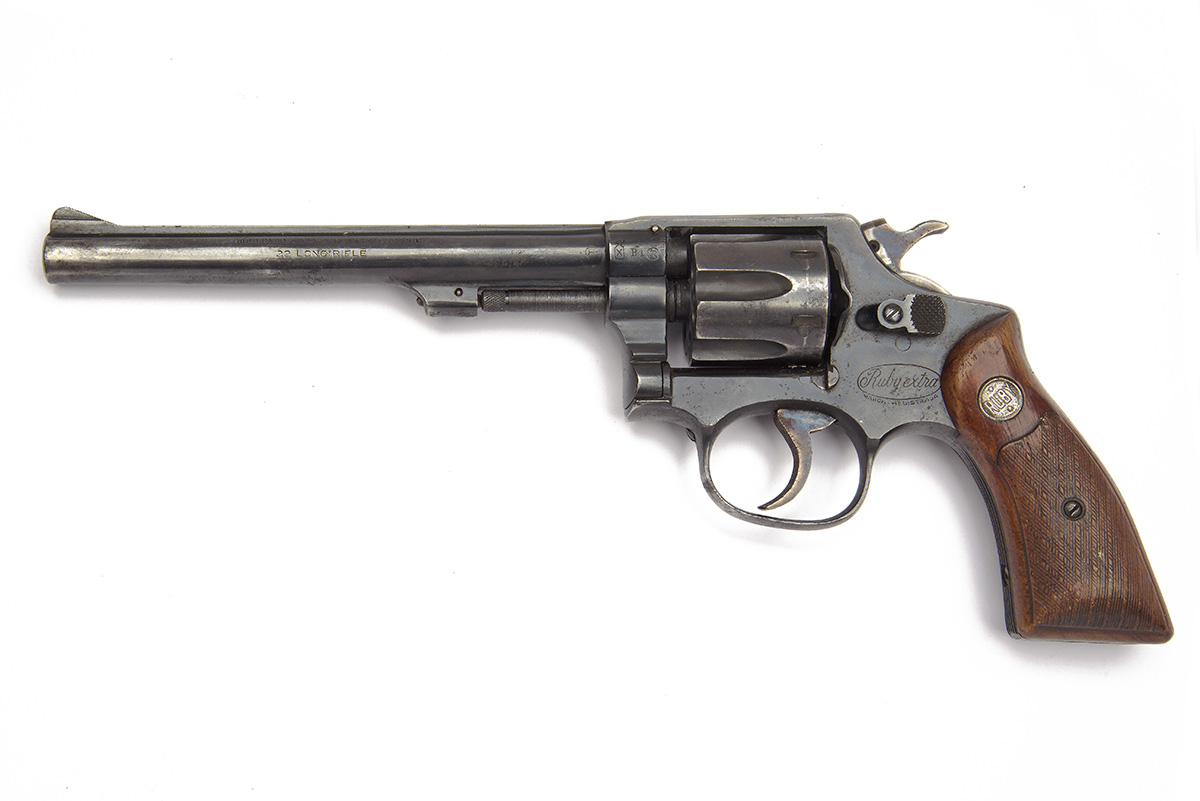 A .22 (L/R) SIX-SHOT REVOLVER SIGNED RUBY, MODEL 'EXTRA', serial no. 534893, with blued and sighted 5 3/4in. barrel, blued fluted swing-out cylinder, solid frame and chequered walnut grips, overall length 10 7/8in.