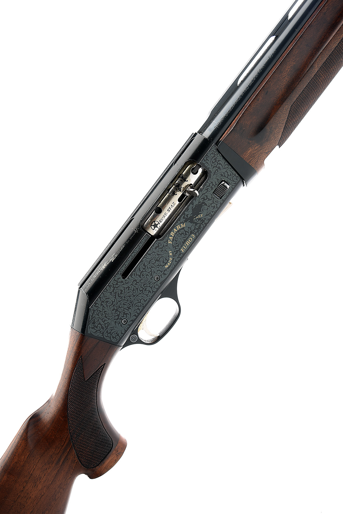 FABARM 12-BORE (3IN.) 'EURO 3' SEMI-AUTO SHOTGUN, serial no. 1023991, for 1999, restricted magazine, 26in. nitro barrel with 7mm raised ventilated matt rib, 3in. chamber, multichoke (no spares), manual push-button safety, magazine cut-off switch, blacked action engraved with acanthus scrollwork, 14 1/4in. pistolgrip stock including buttplate, weight 7lb. 8oz.