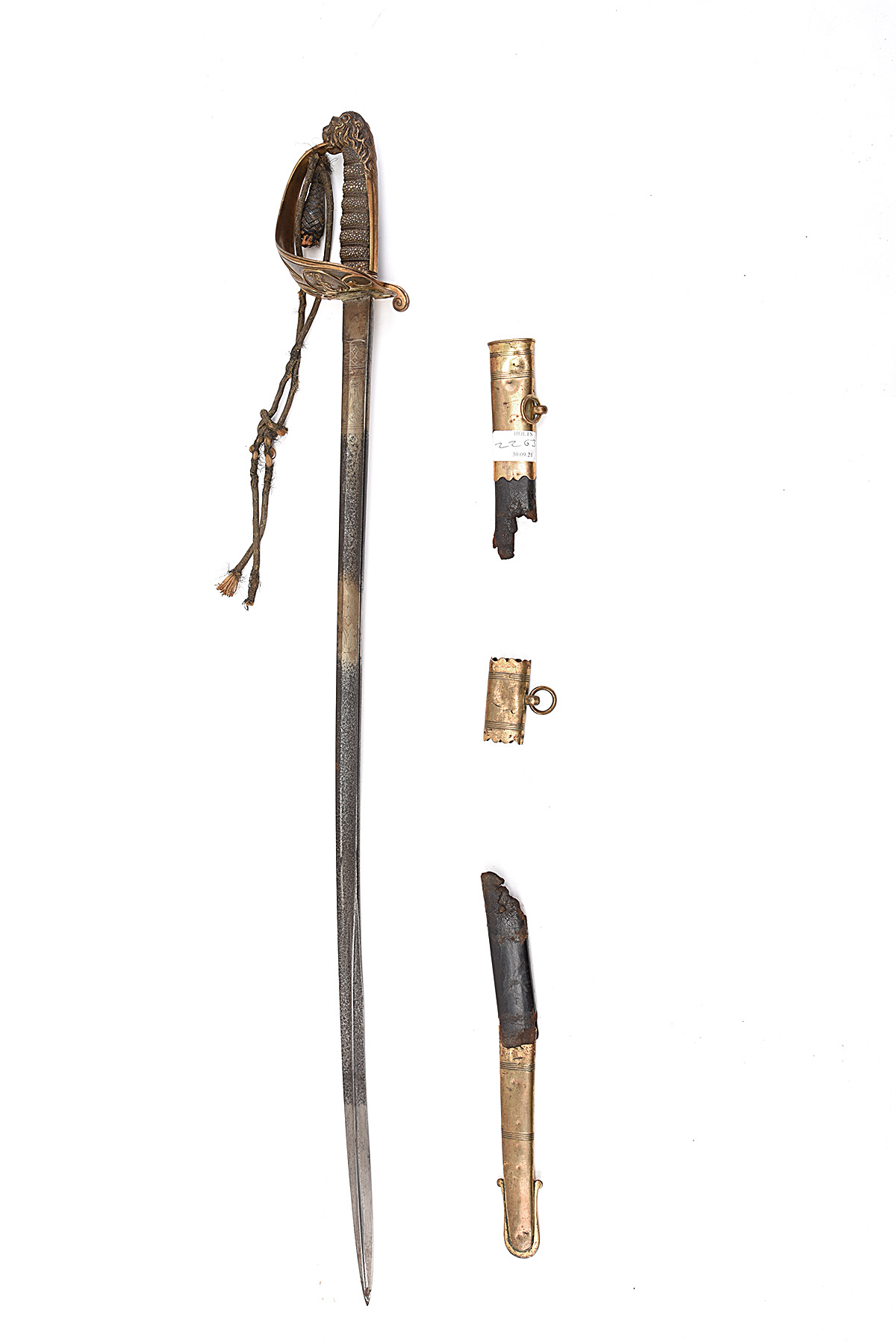 A PATTERN 1827 ROYAL NAVY OFFICER'S PIPE-BACKED SWORD, circa 1840, with 29in. pipe-backed and quill-tipped etched blade, brass hilt with folding inner guard, outer guard with queen's crown fouled anchor cypher, lion's head pommel, wire-bound fish-skin grip, remains of a period sword-knot, scabbard in semi-relic condition, blade stained and pitted, most of scabbard leather missing, brass mounts badly dented