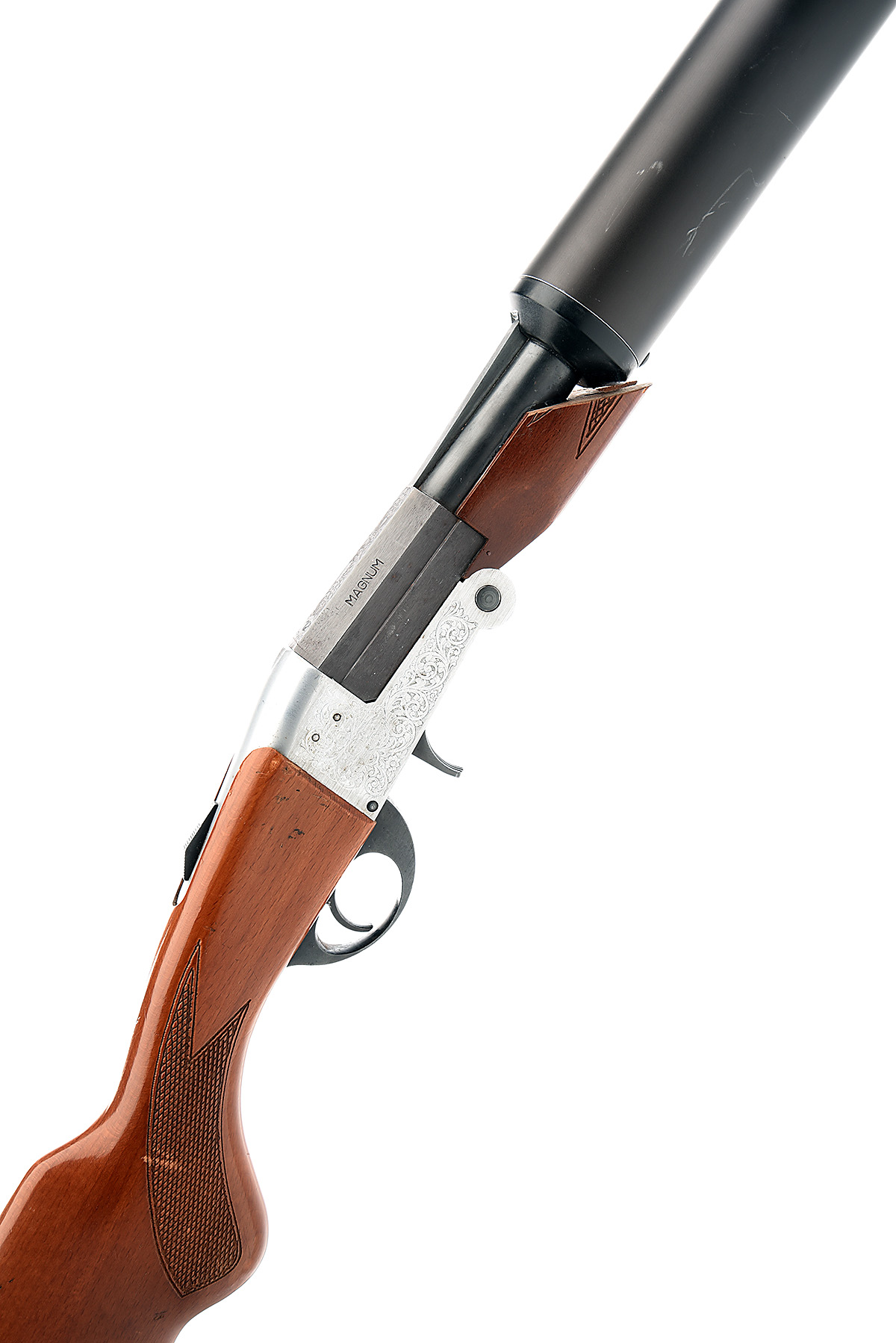 A FULLY MODERATED INVESTARM 12-BORE (3IN.) SINGLE-BARRELLED FOLDING HAMMERLESS SHOTGUN, serial no. 276409, dated 1985, 41 1/4in. nitro reproved barrel including sound moderator, 3in. chamber, manual safety, alloy action with acanthus scroll engraving, 14 1/4in. pistolgrip stock including buttplate, sling swivels, weight 7lb. 13oz.