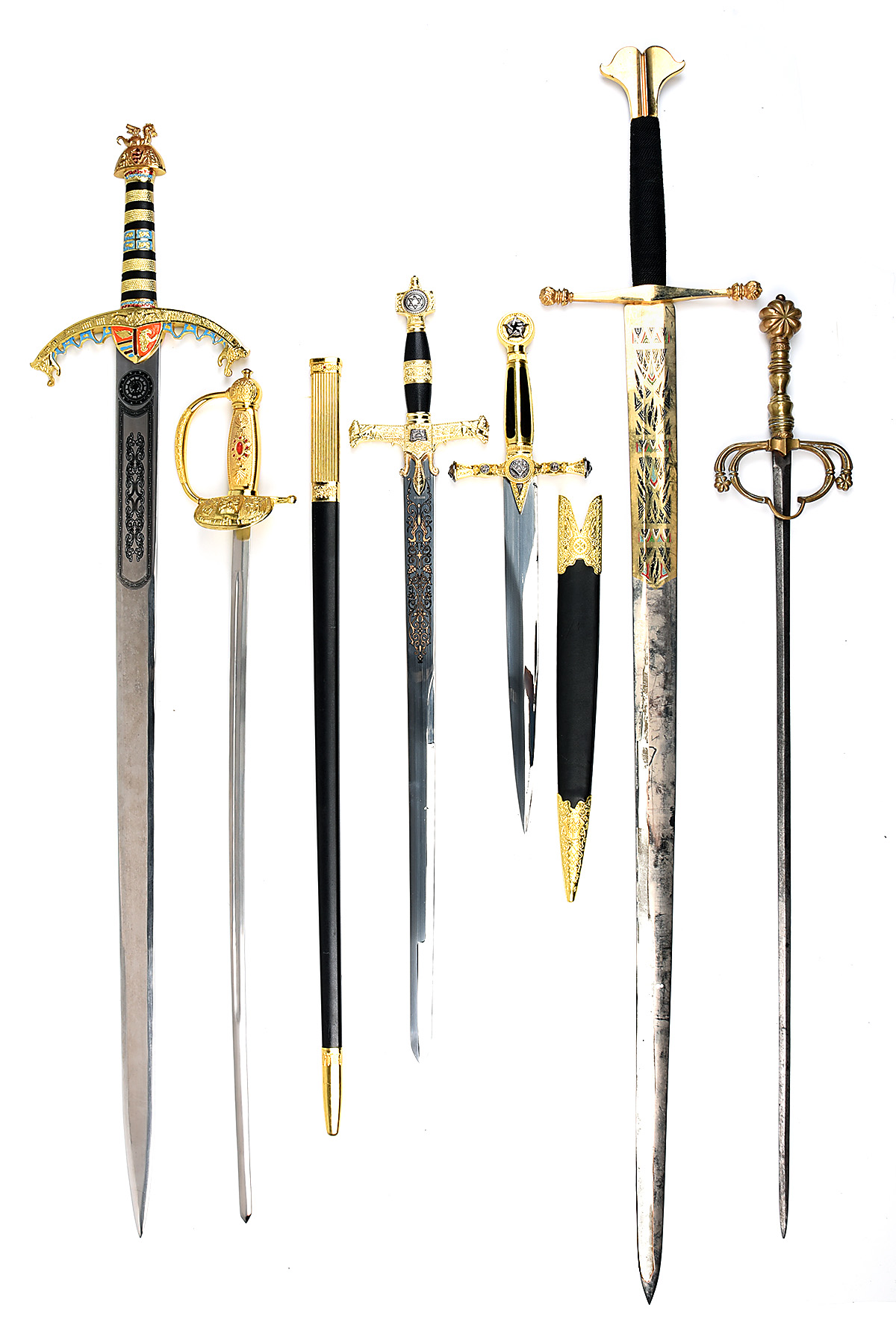 A GROUP OF SIX MODERN FANTASY DECORATIVE SWORDS, 1} broad-sword style, with 37 1/2in. double-edged nickeled steel blade, the top third with gold laquer and inlaid with coloured decoration both sides and marked 'TOLEDO', gold laquered steel straight cross-guard and pommel, grip bound with black string, no scabbard, 48in. overall; 2) broad-sword style with 36in, double-edged nickeled steel blade, the top third with black-filled etching on both sides, curved gold-laquered aluminium cross-guard with heraldic langets, plastic covered grip, heraldic gold-laquered pommel, no scabbard, 45in. overall; 3) court-sword style, with 28in. double-edged steel blade fullered on each side, sprayed gold decorative hilt and guards, with red plastic jewel-work, with its black and gold plastic scabbard, 35in. overall ; 4) rapier/court-sword style with 29in. double-edged steel blade with ornate brass hilt and cross-guard, no scabbard, possibly a late Victorian copy, 35in. overall; 5) a boxed short broad-sword style with 23in. double-edged steel bladed with painted scroll-work design both sides on top third, sprayed gold decorative hilt and cross-guard, together with its unused mounting-board, 30in. overall; 6) boxed short-sword with plain 14in double-edged steel blade, sprayed gold hilt and cross-guard decorated with Masonic imagery, together with its plastic-covered scabbard with gold-sprayed fittings, 22in. overall