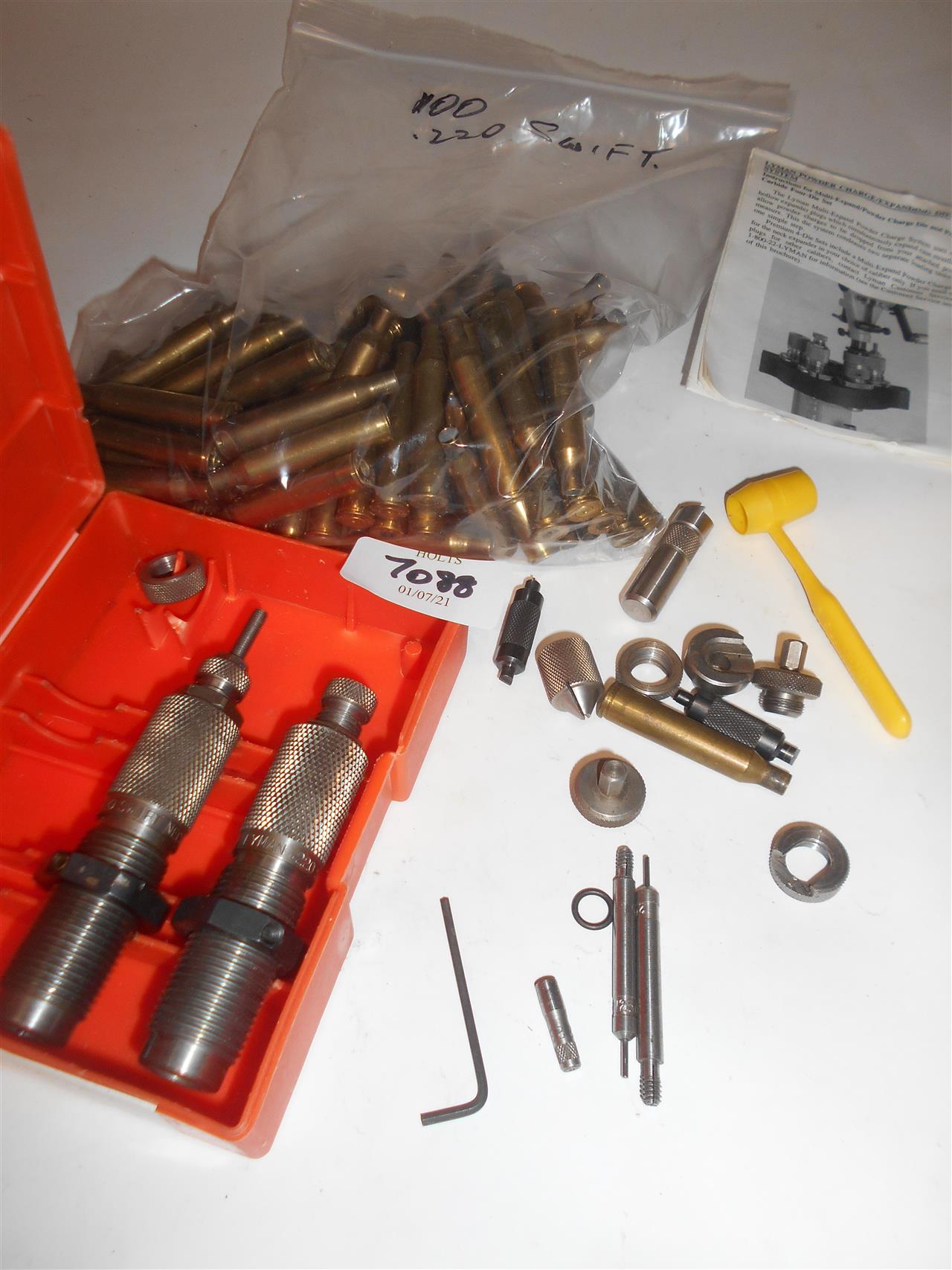 .220 SWIFT LYMAN DIE SET AND CASES FOR RELOADING WITH OTHER SMALL TOOLS, comprising of a Lyman 2 part dies set, case trimmer, case length gauge, case holder, primer pocket cleaner and other small tools with 100 Remington Peters and Federal unprimed fired cases