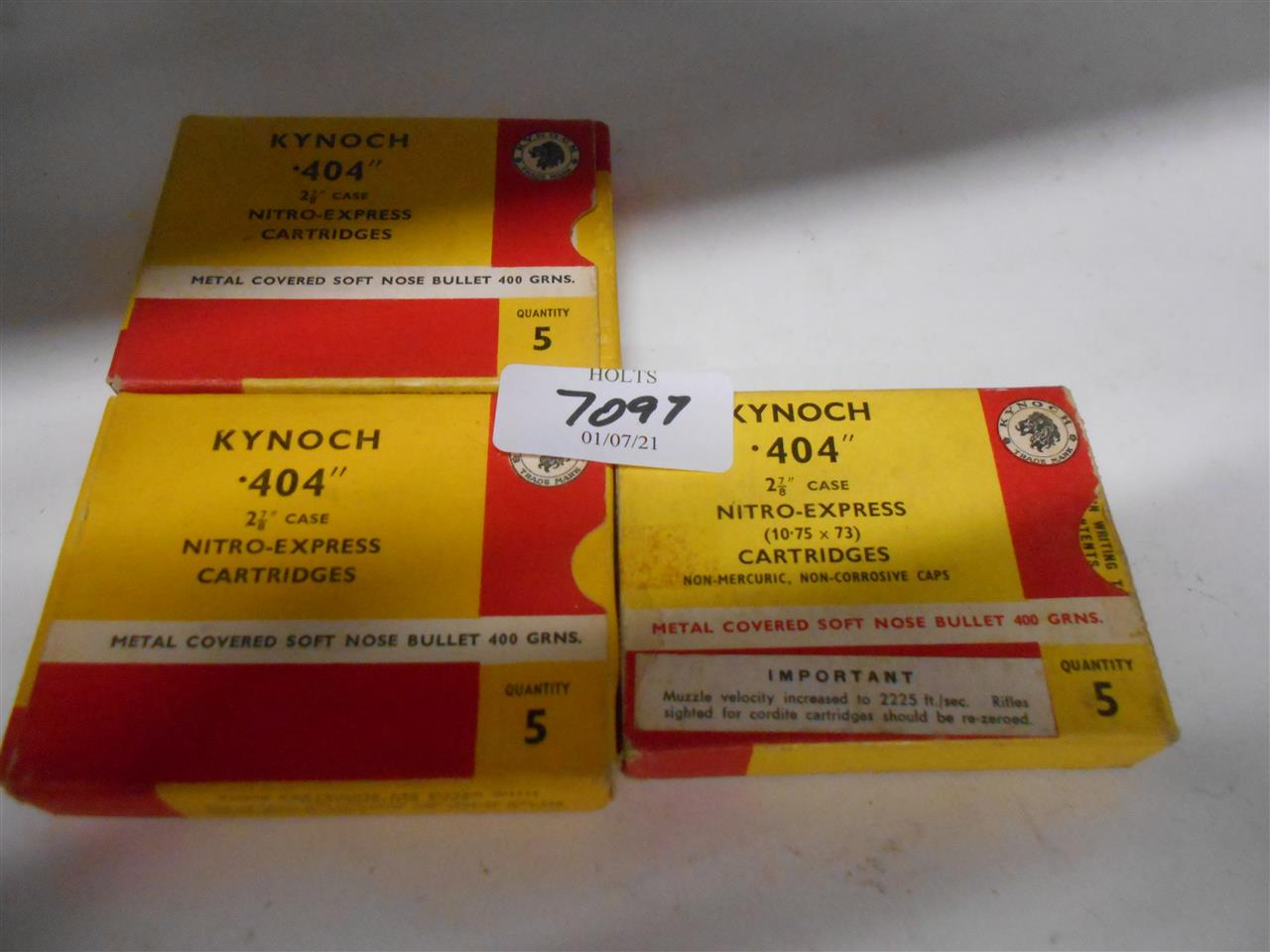 15 ROUNDS .404 NE 2 7/8ths CASE (10.75 X 73) AMMUNITION BY KYNOCH 400 GRN SN Please be advised that cartridges/ammunition, primers, primed cases, blanks and percussion caps cannot be sent to you by post or carrier. If you wish you can book a collection at one of our regional valuation days or collect from our offices at PE31 6HA in Norfolk