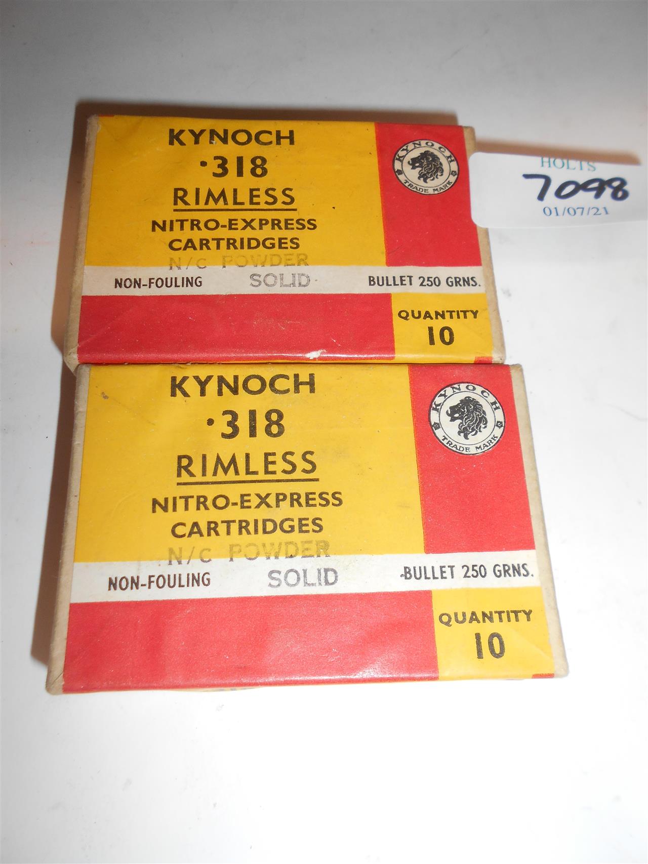 20 ROUNDS .318 RIMLESS AMMUNITION BY KYNOCH 250 GRN SOLID Please be advised that cartridges/ammunition, primers, primed cases, blanks and percussion caps cannot be sent to you by post or carrier. If you wish you can book a collection at one of our regional valuation days or collect from our offices at PE31 6HA in Norfolk