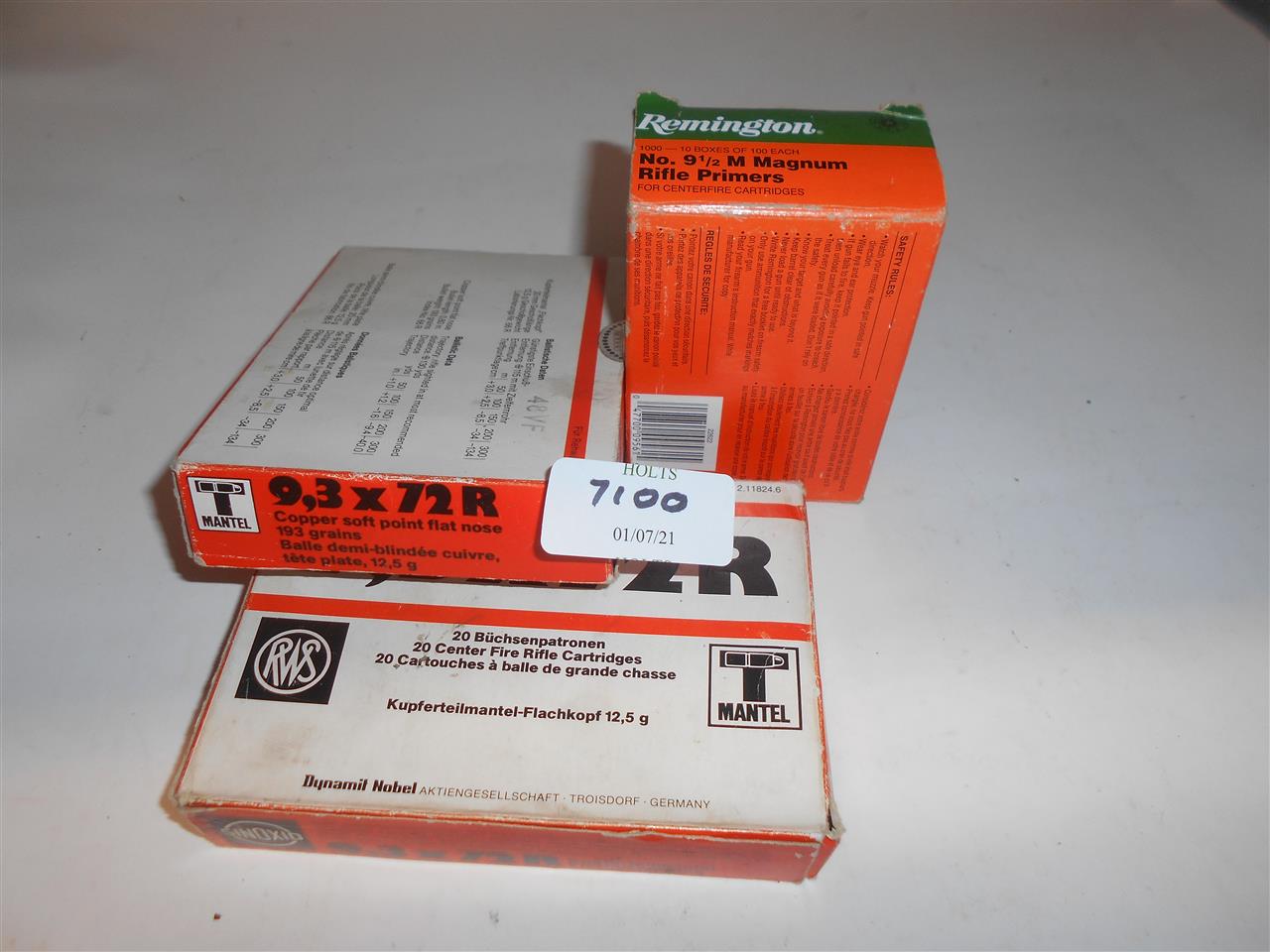 15 ROUNDS RWS 9.3 x 72R SP 193 Grn. AMMUNITION, 22 FIRED RWS CASES, 700 LARGE RIFLE REMINGTON TYPE 9 1/2 MAGNUM PRIMERS Please be advised that cartridges/ammunition, primers, primed cases, blanks and percussion caps cannot be sent to you by post or carrier. If you wish you can book a collection at one of our regional valuation days or collect from our offices at PE31 6HA in Norfolk