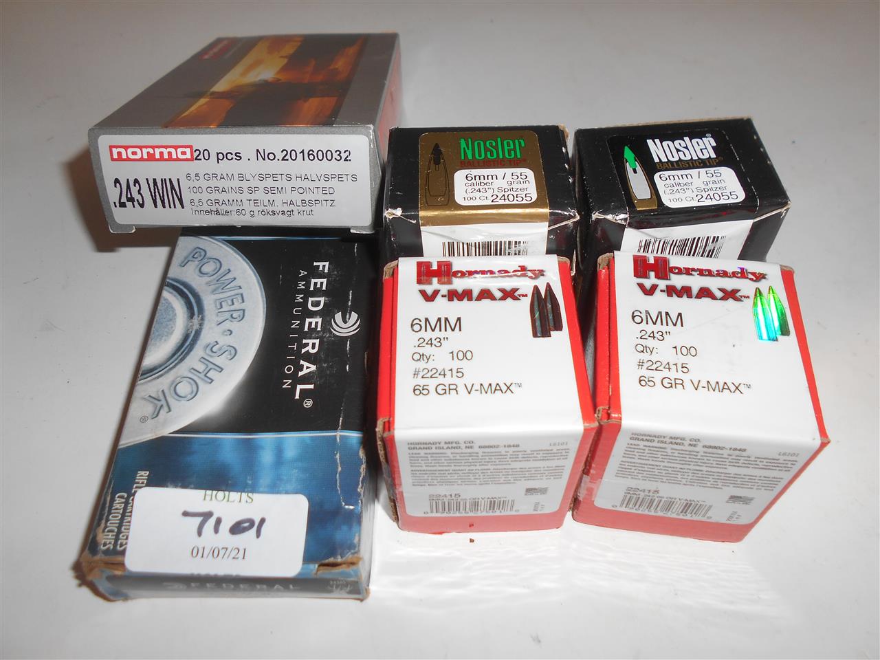 15 ROUNDS .243 NORMA 100 Grn. SP AMMUNITION, 18 FIRED CASES, 400 .243 (6mm) HORNADY & NOSLER BULLETS, comprising of:
