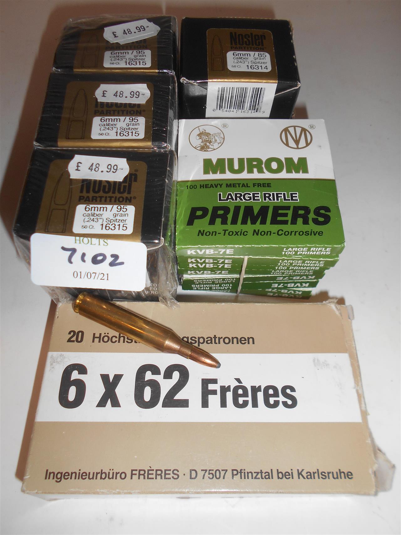 20 ROUNDS 6 x 62 FRERES 6.5 Grm. (100 Grn) SP AMMUNITION BY MEN, WITH 400 6mm BULLETS AND 800 LARGE RIFLE PRIMERS, comprising of: