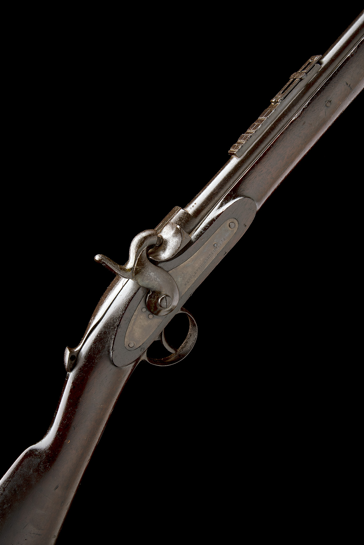 dated for 1879, with round 25in. barrel marked 'WHITWORTH PATENT', block and blade fore-sight, period replacement elevating ladder rear-sight with four additional flush-folding leaves, rear-mounted lift-up breech lever marked 'MANUFACTURED BY WESTLEY RICHARDS' and marked with a triangle trademark containing a letter 'C', colour hardened bar-action lock signed on the bar 'WESTLEY RICHARDS & CO, 1879', external hammer, walnut full-stock, iron furniture, the heel-plate with central trapdoor and ball tipped under-barrel clearing rod, strong traces of finish below staining, overall length 41 1/4in., weight approximately 7 1/4lbs.