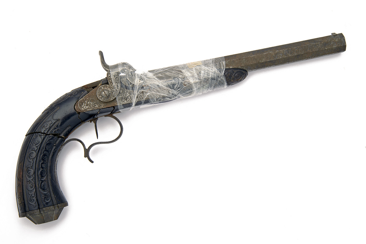 * A 36-BORE PERCUSSION TARGET-PISTOL FOR RENOVATION SIGNED 'ADAM KUCHENREUTER', no visible serial number,