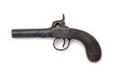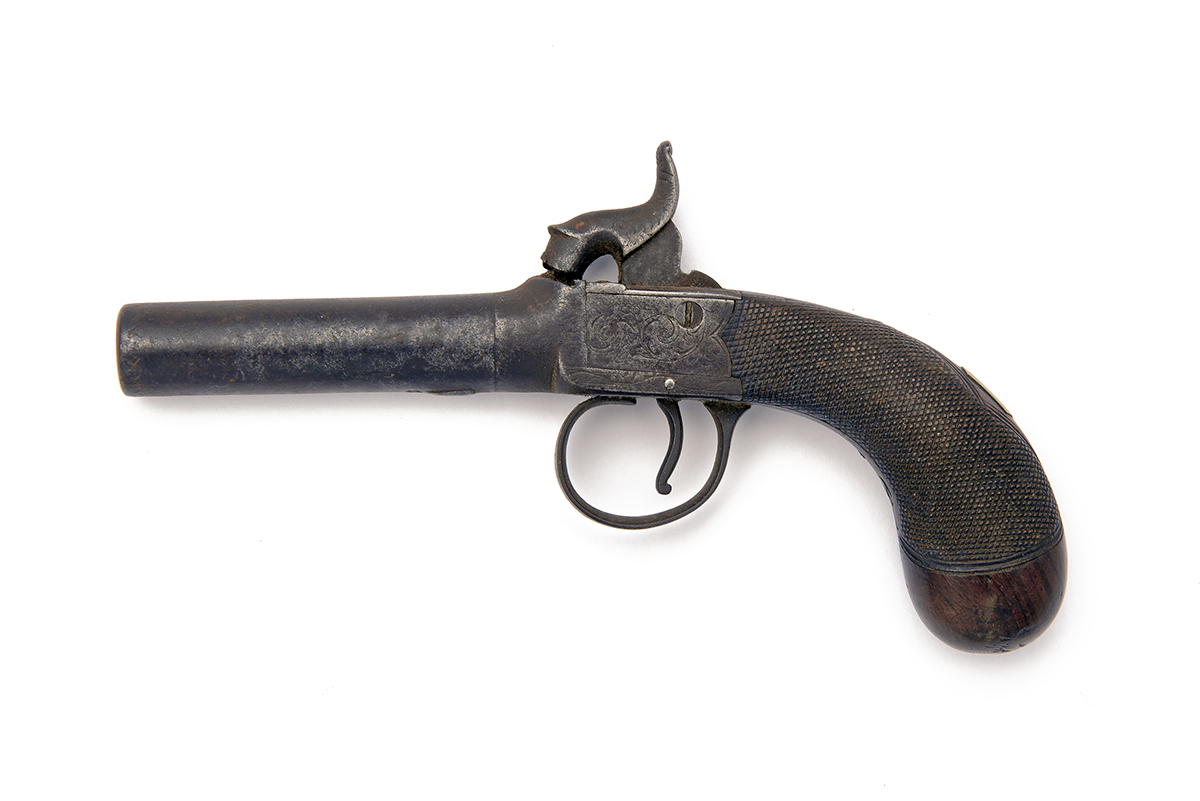 circa 1840, with 2 3/4in. turn-off round barrel (frozen), engraved boxlock action with guarded trigger and central hammer and chequered walnut bag-shaped butt