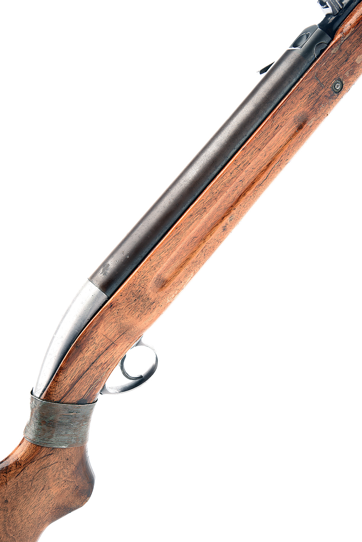 for between 1948 &1950, with sighted 18 1/2in. barrel, plain air-chamber (no etching visible), walnut three-piece stock (cracked, crude repair) and flush under-lever, 43 3/4in. overall