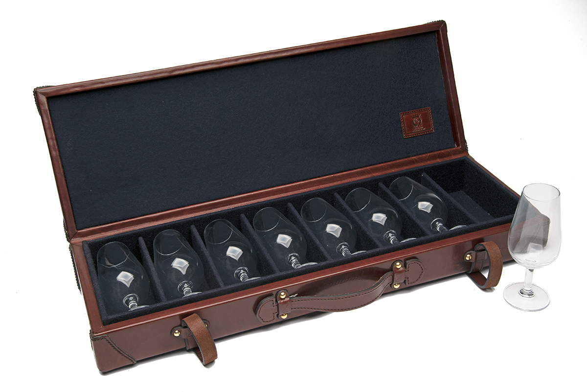 AN UNUSED REY PAVON HONEY LEATHER-CASED SET OF EIGHT PORT GLASSES,